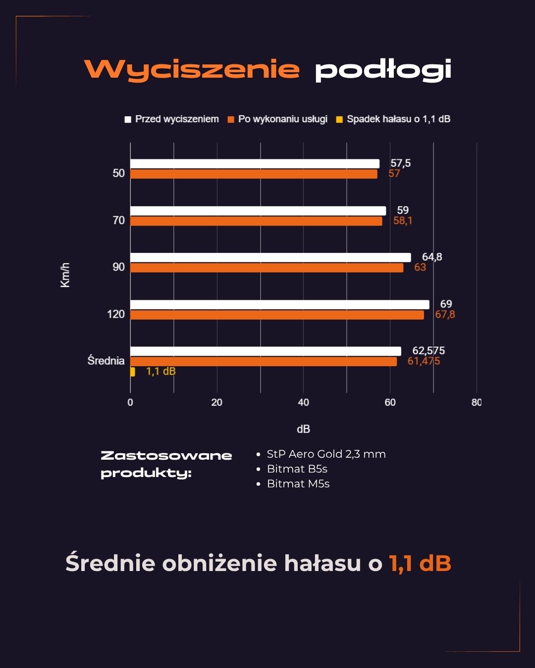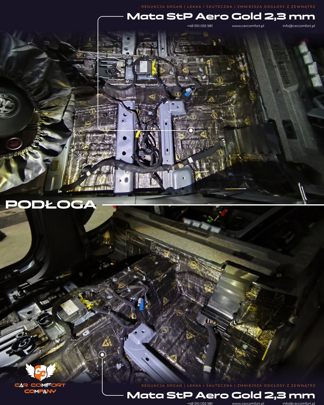 Podłoga została wyciszona matą butylową StP Aero Gold 2,3 mm, która skutecznie usztywnia konstrukcję i redukuje drgania przenoszone z nawierzchni.