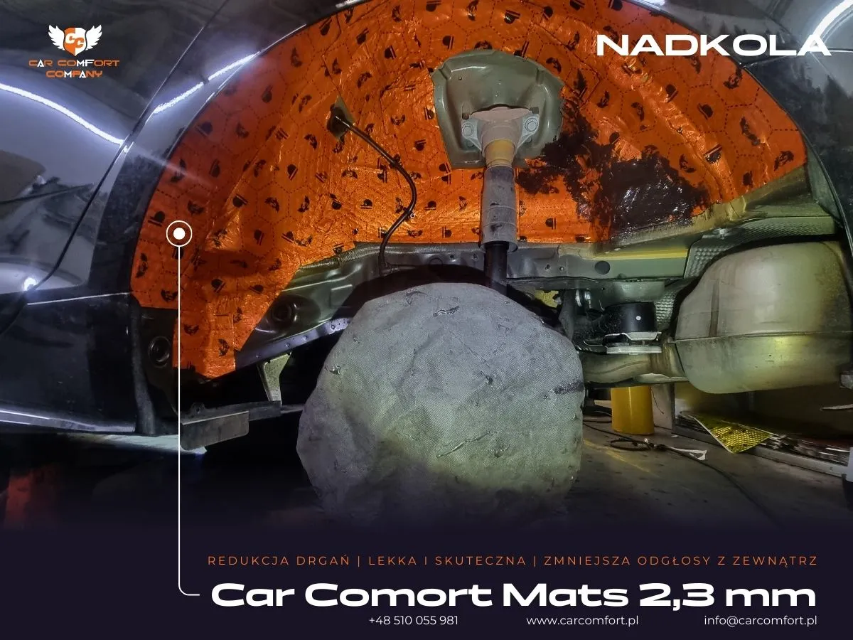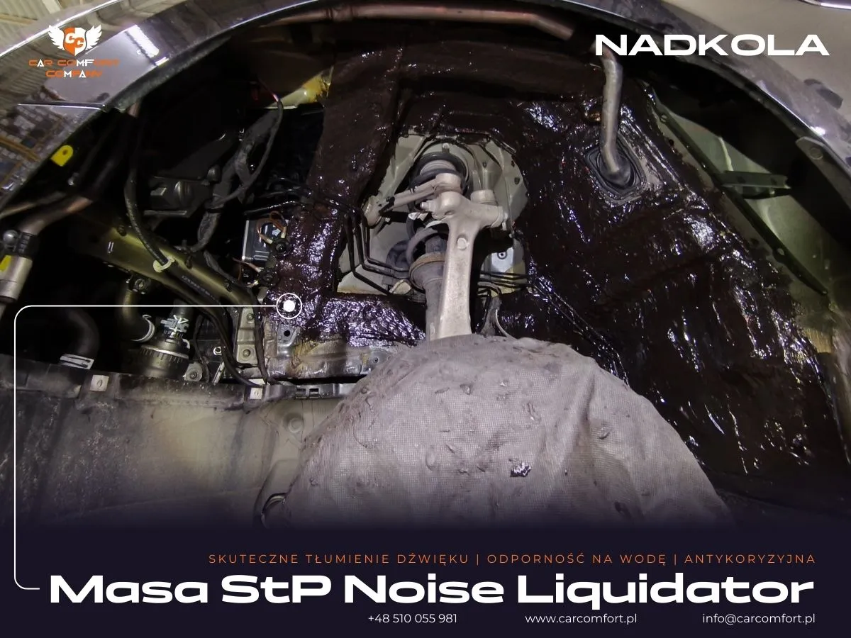 W Audi A5 skoncentrowaliśmy się na precyzyjnym wyciszeniu nadkoli, które są często głównym źródłem hałasu z drogi i szumu opon. Na metalową część nadkola jako pierwszą warstwę zaaplikowano matę butylową Car Comfort Mats. Ta wysokiej jakości mata doskonale tłumi wibracje i rezonanse, tworząc solidną barierę akustyczną. Następnie, dla jeszcze lepszego efektu, zastosowano StP Noise Liquidator – innowacyjny preparat wyciszający, który utwardza powierzchnię i niweluje wszelkie pozostałe drgania, co znacząco zwiększa efektywność wygłuszenia.