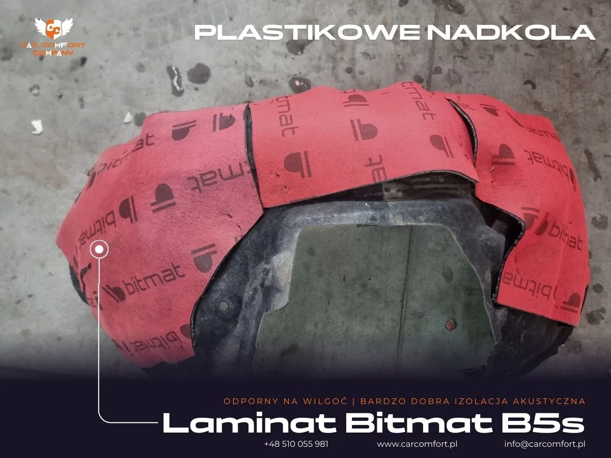W przypadku nadkoli plastikowych w Audi A5, zastosowaliśmy dwuwarstwową izolację, aby maksymalnie zredukować przenikanie hałasu. Na ich wewnętrzną stronę trafiła mata butylowa Car Comfort Mats, która jest pierwszą, solidną warstwą tłumiącą. Jako drugą warstwę, dla dodatkowej izolacji akustycznej i pochłaniania dźwięku, użyliśmy pianki Bitmat B5s. To połączenie materiałów zapewnia kompleksową redukcję hałasu dochodzącego z okolic kół, co przekłada się na znacznie cichszą i przyjemniejszą jazdę.