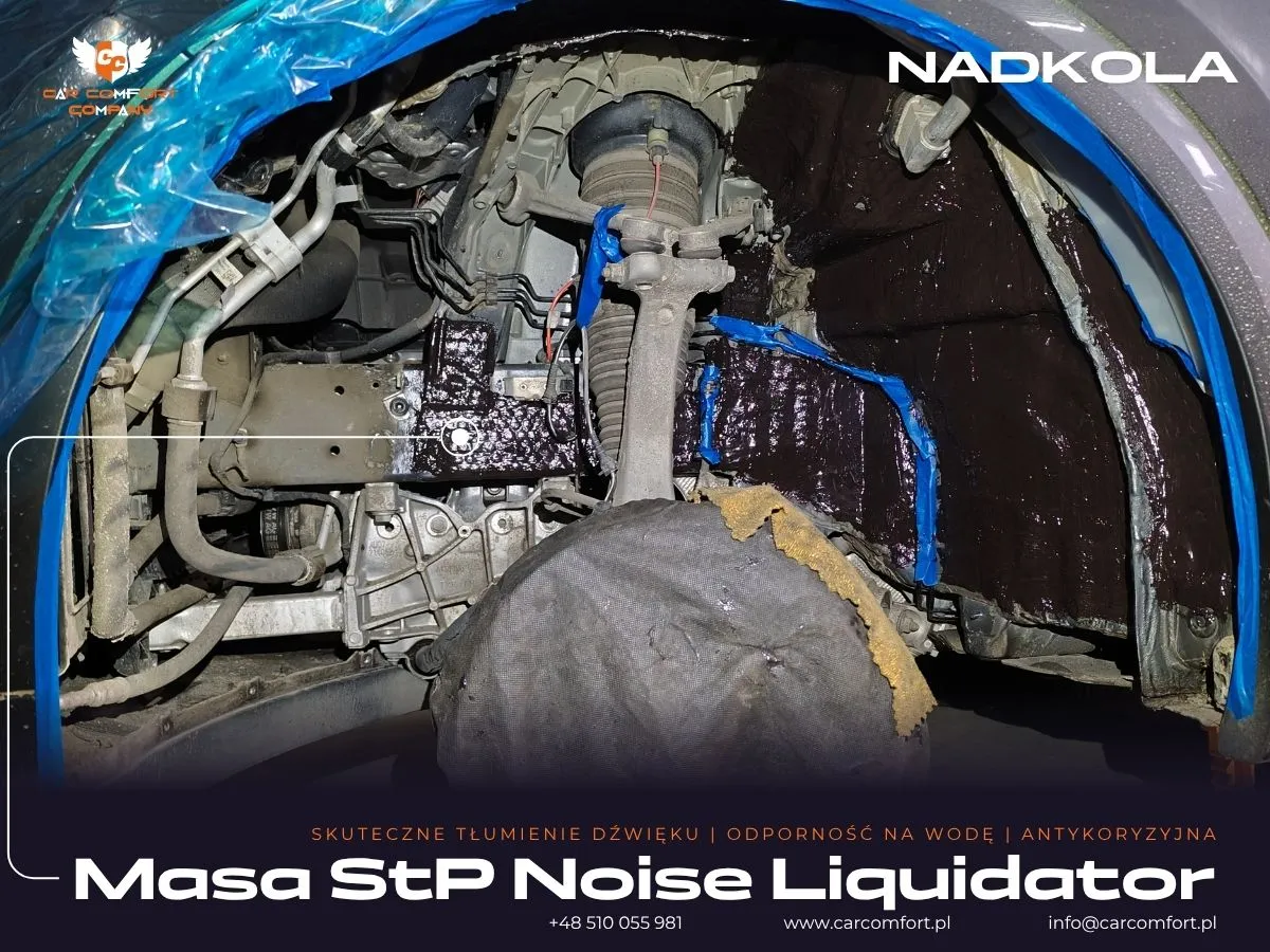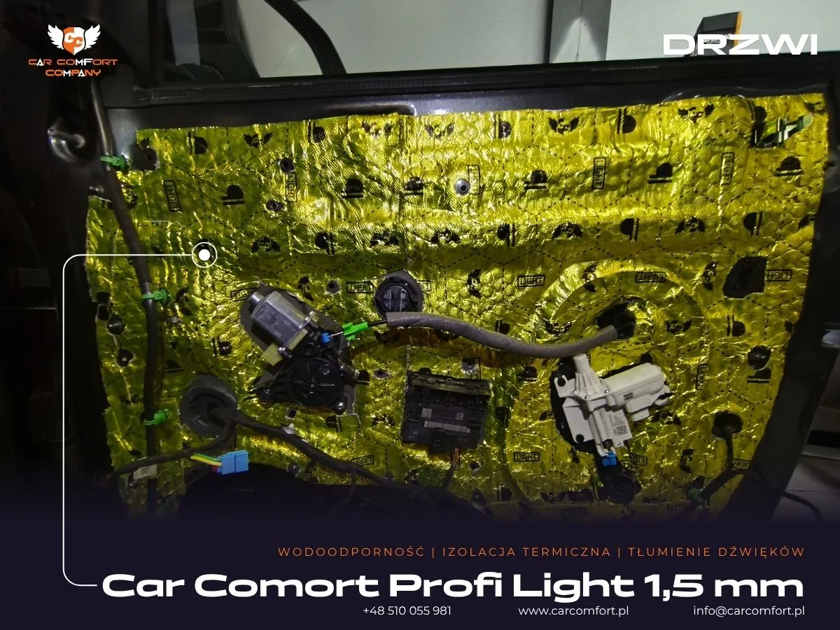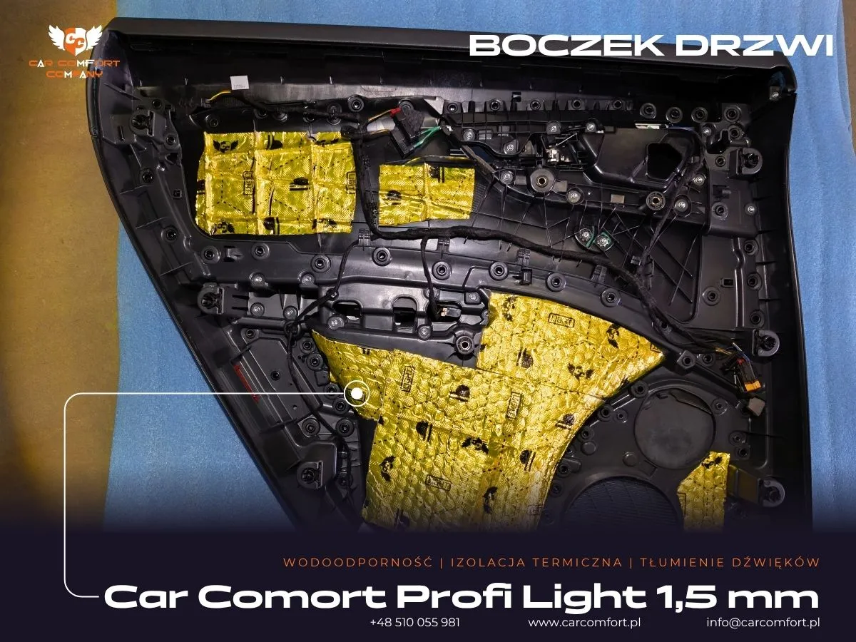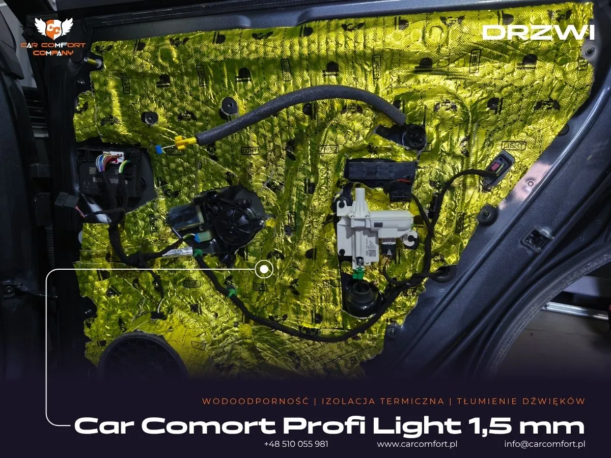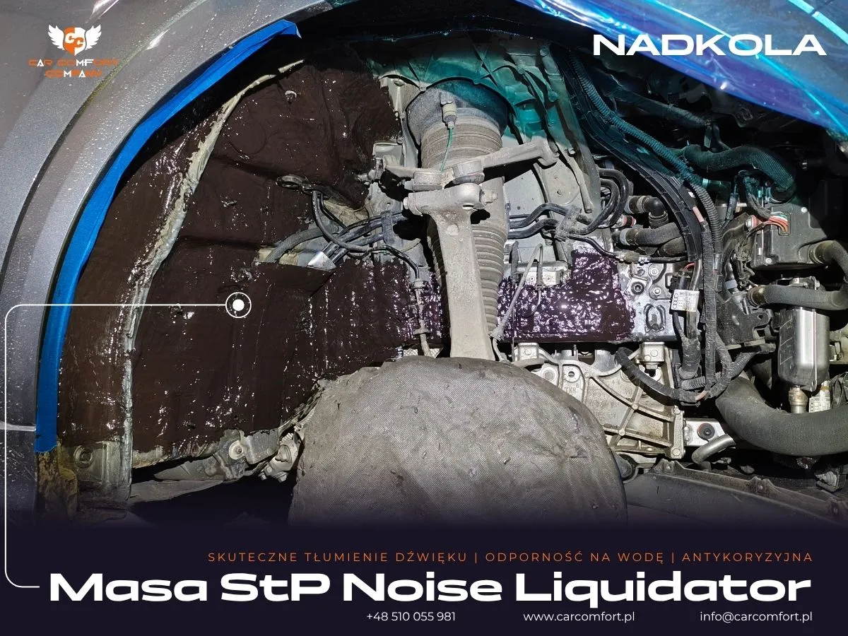 Do wyciszenia drzwi w Audi Q8 zastosowano trójwarstwową izolację: Car Comfort Profi jako pierwszą i trzecią warstwę, oraz Accent jako warstwę drugą, skutecznie tłumiącą wibracje i pochłaniającą dźwięki. Boczki drzwi również zostały wzmocnione materiałem Car Comfort Profi. Metalowe nadkola otrzymały Car Comfort Profi jako pierwszą warstwę i StP Noise Liquidator jako drugą, co zapewnia doskonałą barierę dla hałasu z kół. Na nadkola plastikowe zaaplikowano Bitmat K3s. Całość uzupełniła aplikacja matowej folii PPF na karoserii, która oferuje nie tylko ochronę, ale i unikatowy wygląd.