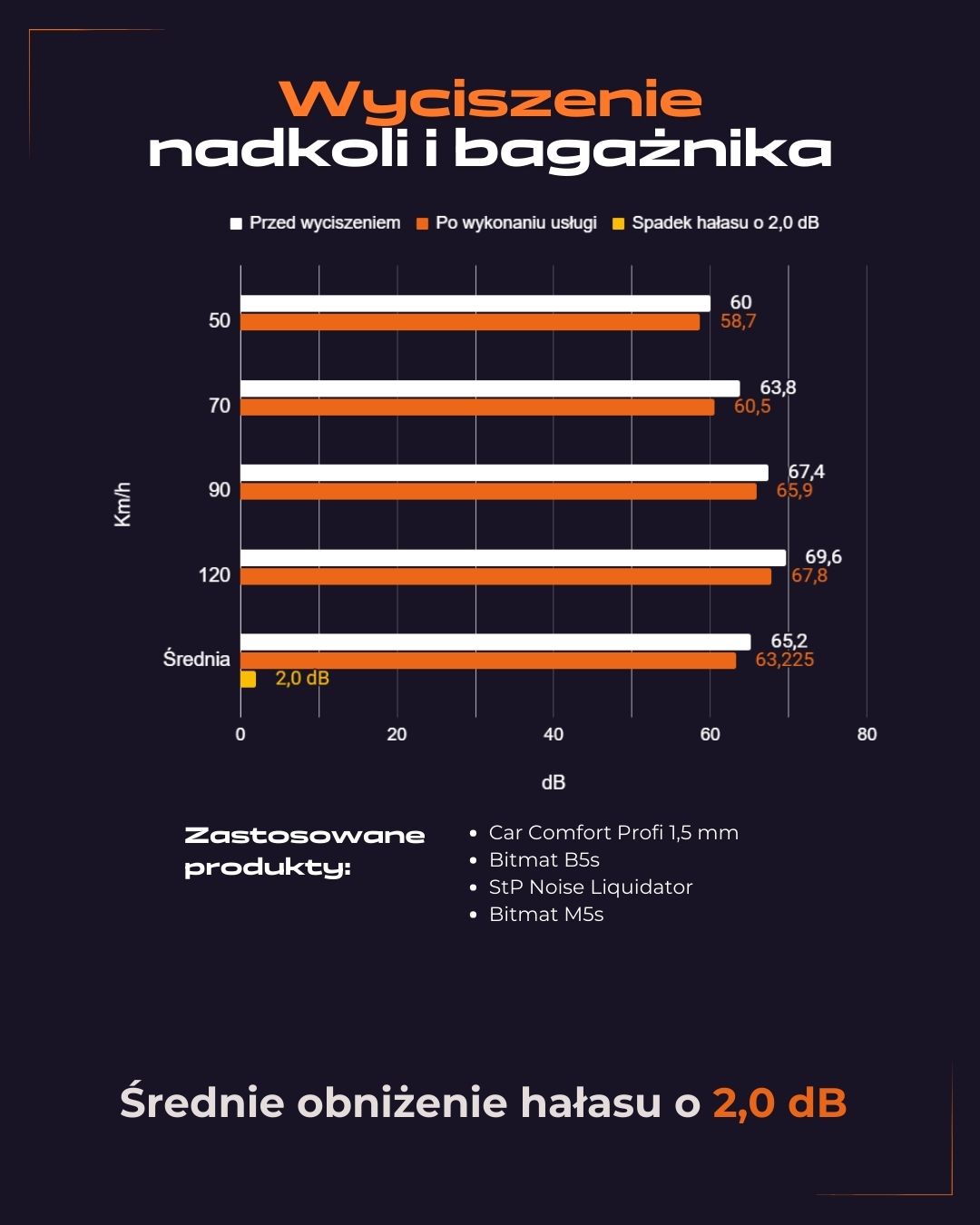 Bagażnik został wyciszony matą Car Comfort Profi 1,5 mm jako warstwą bazową, a następnie uzupełniony materiałami Bitmat B5s oraz Bitmat M5s, które pochłaniają drgania i ograniczają rezonanse tylnej części nadwozia.