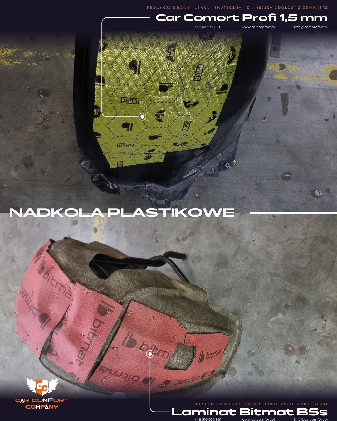 Metalowe nadkola otrzymały matę Car Comfort Profi 1,5 mm, a jako drugą warstwę zastosowano StP Noise Liquidator, skutecznie tłumiący drgania blachy i ograniczający szum drogowy.