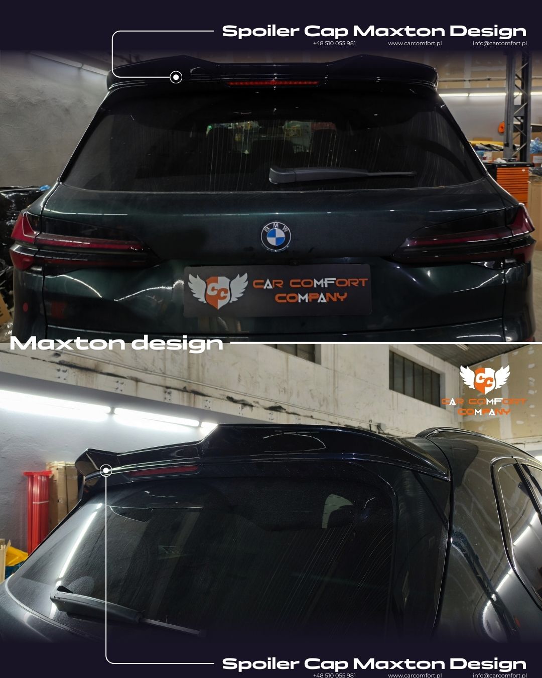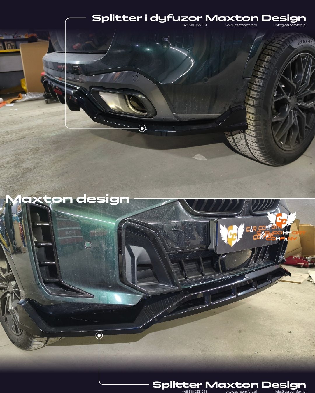 W ramach realizacji zamontowany został kompletny zestaw elementów aerodynamicznych i stylizacyjnych Maxton Design dedykowany modelowi BMW X5 G05. Splitter przedni poprawia optykę przodu auta nadając mu bardziej agresywny, sportowy charakter i wizualnie obniża sylwetkę pojazdu. Dokładki progów podkreślają linię boczną BMW X5 i optycznie wydłużają nadwozie, spójnie łącząc przód z tyłem auta. Splitter tylny z dyfuzorem to element, który najbardziej zmienia wygląd tylnej partii – dyfuzor nadaje sportowego sznytu i nawiązuje do estetyki aut wysokiej wydajności. Spoiler Cap na krawędź dachu zamyka całość zestawu, dodając dynamiki sylwetce BMW X5 G05 widzianego z tyłu.