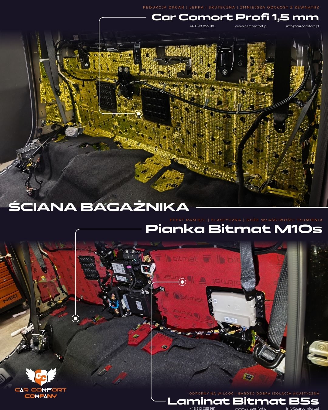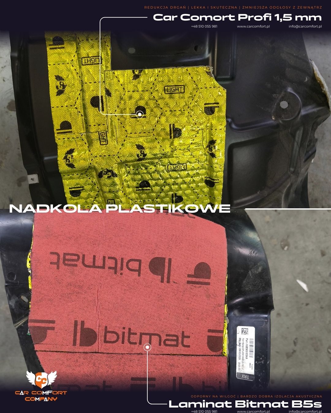 Plastikowe nadkola zostały wyciszone przy użyciu maty butylowej Car Comfort Profi 1,5 mm, która tłumi drgania i stabilizuje elementy konstrukcyjne.