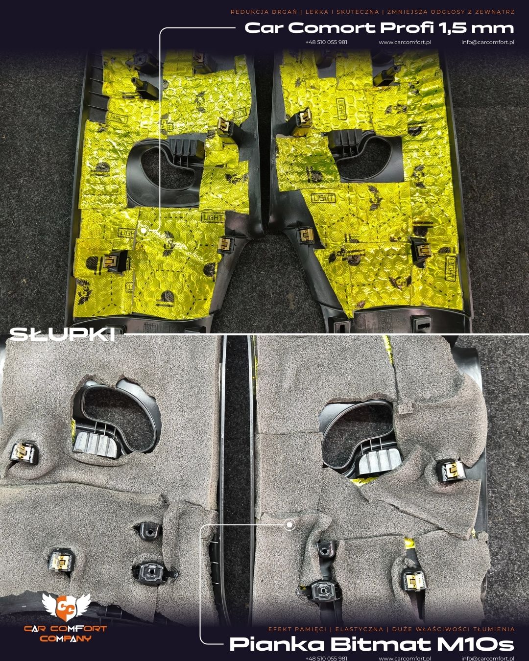 Słupki zostały wyciszone matą Car Comfort Profi 1,5 mm, a elementy plastikowe otrzymały dodatkową warstwę Bitmat M10s, która eliminuje rezonanse i trzaski plastikowych elementów wnętrza.