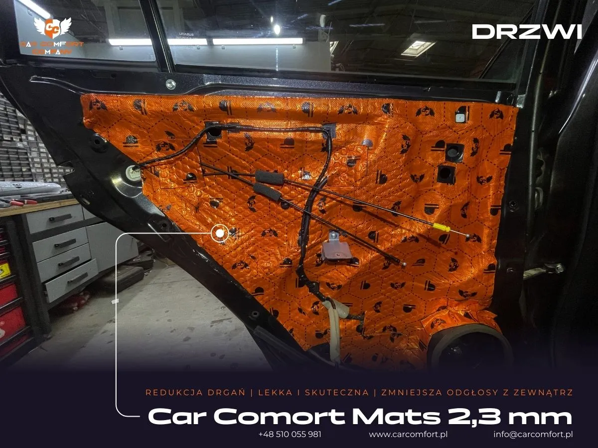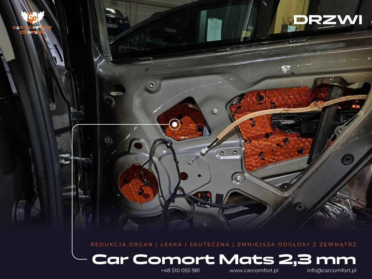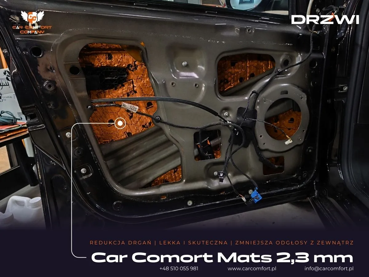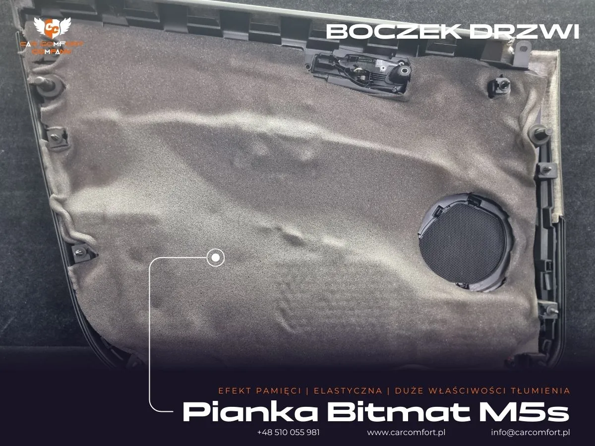 Aby w pełni wykorzystać potencjał nowego systemu, wykonaliśmy profesjonalne wyciszenie drzwi. Na wewnętrzną i zewnętrzną blachę drzwi zaaplikowano matę butylową Car Comfort Mats, która skutecznie tłumi wibracje i rezonanse, tworząc idealne warunki akustyczne dla głośników. Boczki drzwi również zostały wygłuszone matą Car Comfort Mats, a jako warstwę uzupełniającą zastosowano piankę Bitmat M10s, która redukuje rezonanse i pochłania fale dźwiękowe.