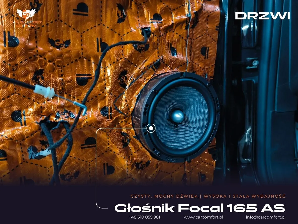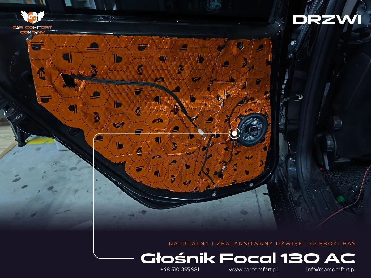 W tak przygotowanych drzwiach zamontowany został zestaw odseparowany Focal 165 AS. Dzięki wyciszeniu, głośniki mogą pracować z pełną mocą, dostarczając czysty i dynamiczny dźwięk bez niepożądanych drgań.