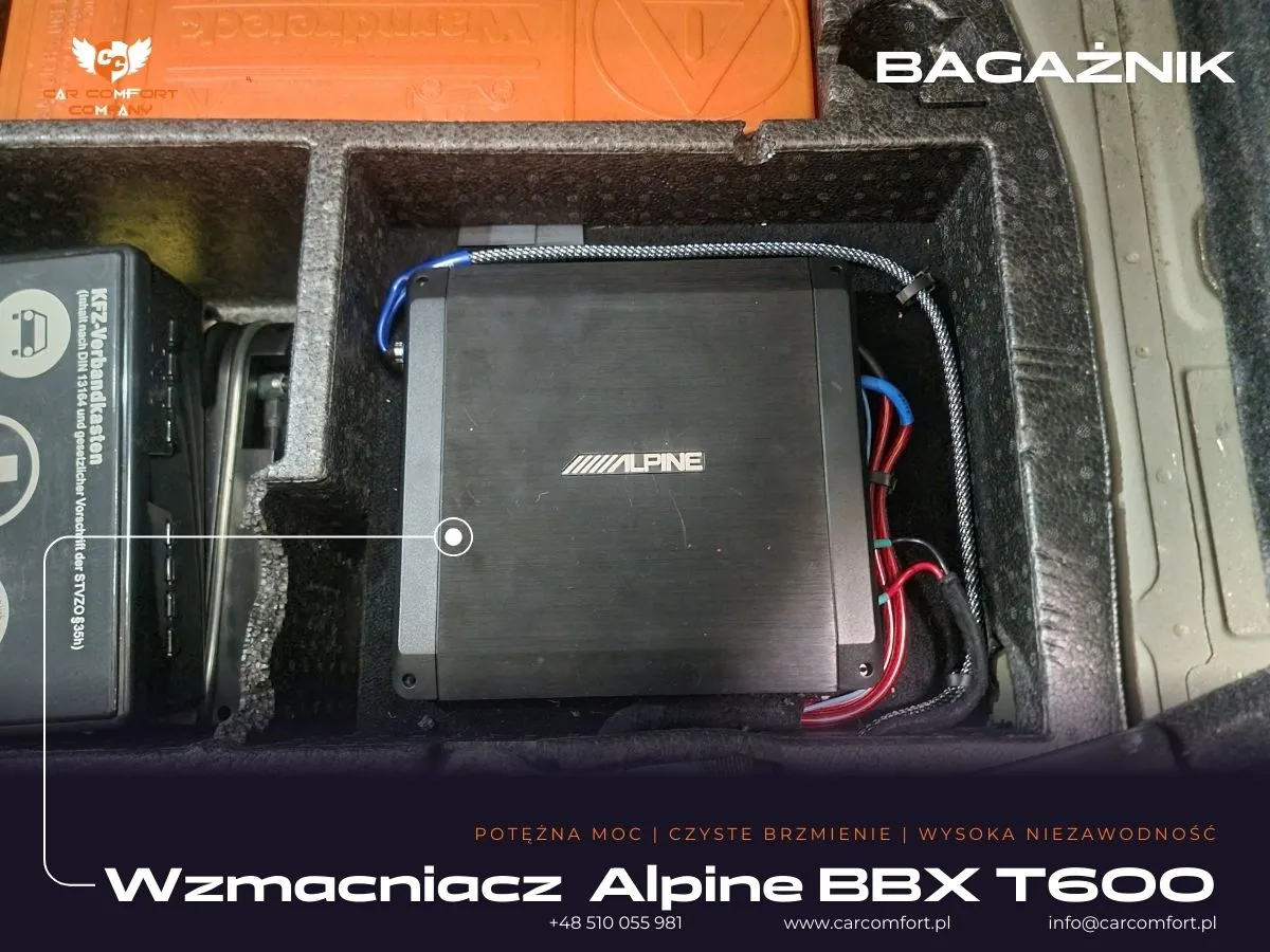 Dla uzyskania głębokiego i mocnego basu, w bagażniku zainstalowany został kompaktowy subwoofer Alpine SWG 844. Subwoofer jest zasilany przez dedykowany wzmacniacz Alpine BBX T600, który dostarcza wystarczającą moc, aby napędzić zarówno subwoofer, jak i głośniki przednie. Wzmacniacz został zamontowany w sposób dyskretny, nie ograniczając znacząco przestrzeni bagażowej, a jego okablowanie wykonano z użyciem wysokiej jakości przewodów zasilających i sygnałowych, co gwarantuje stabilną i czystą pracę systemu.