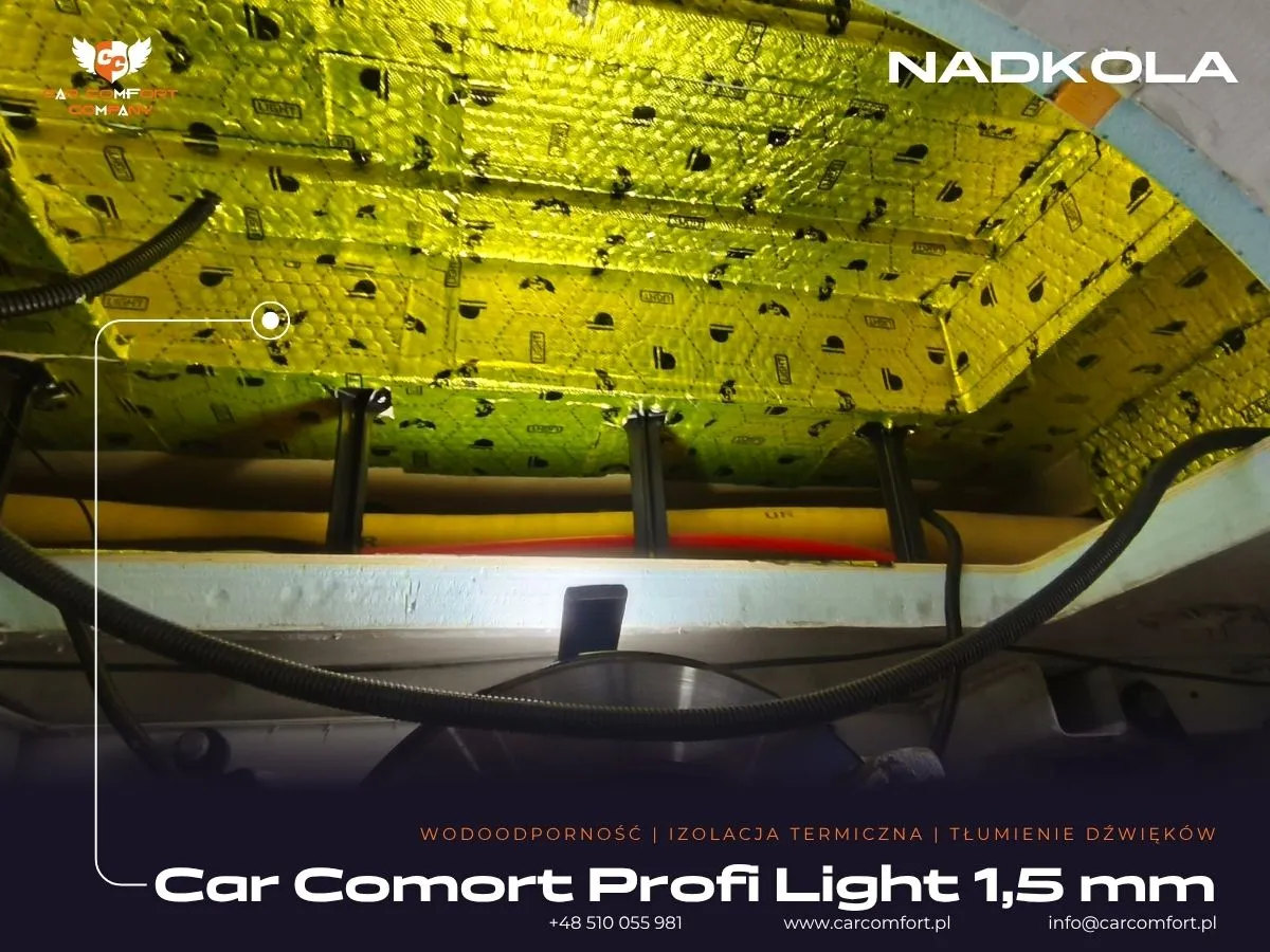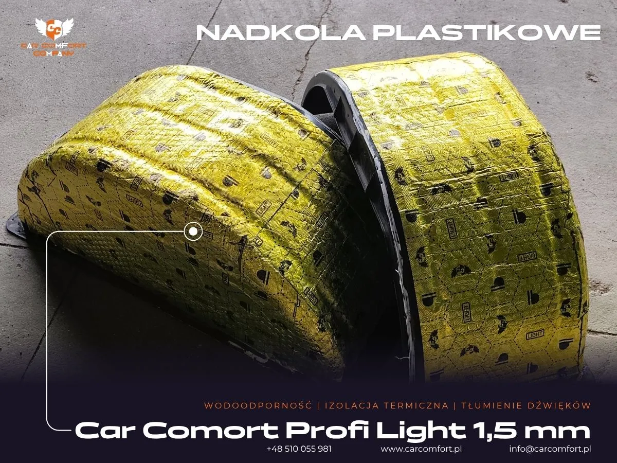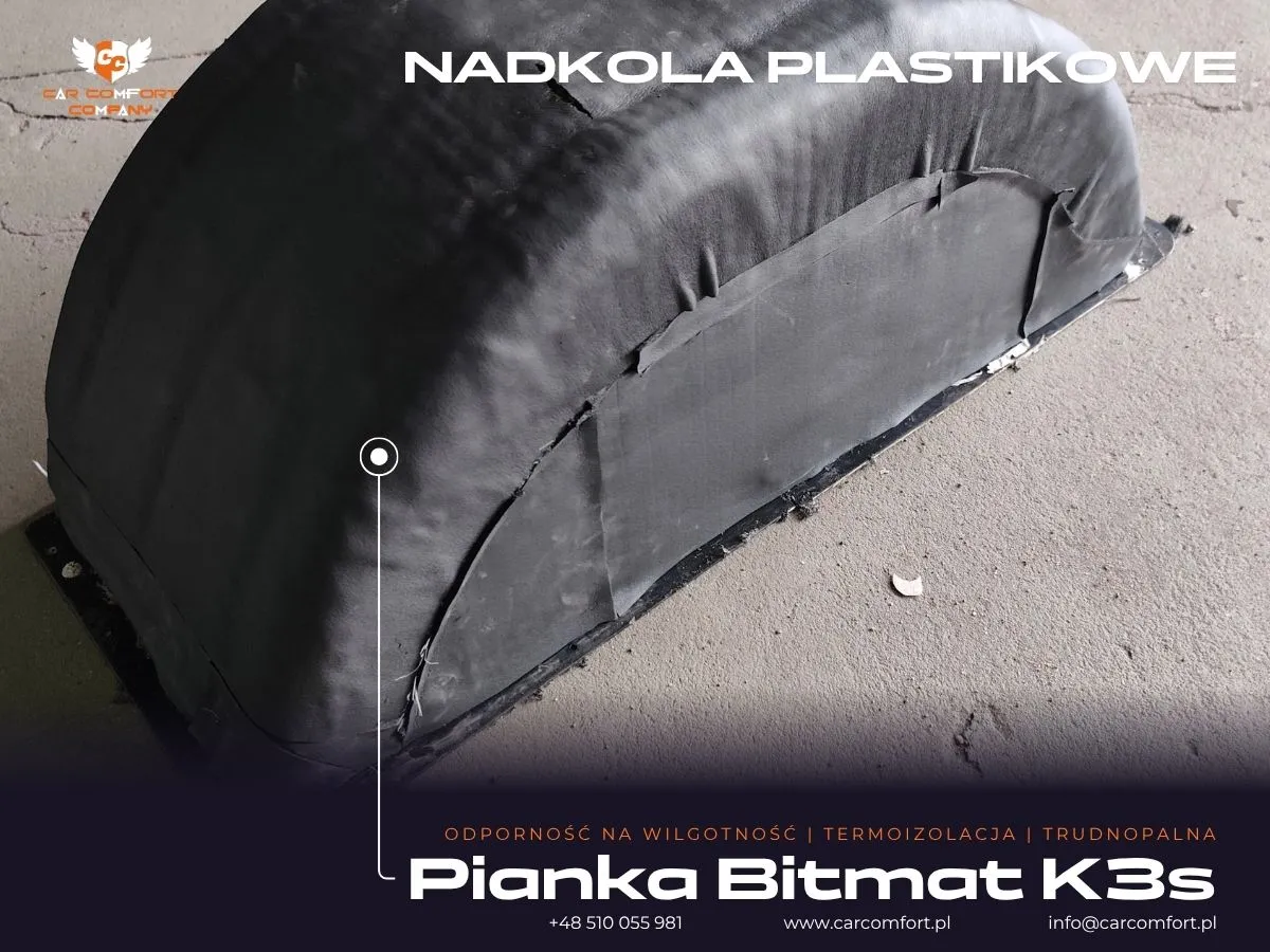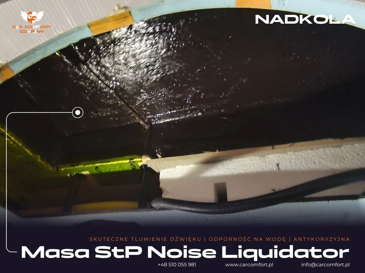 - Nadkola (Komplet): Na metalowe części nadkoli, jako warstwę tłumiącą wibracje, zaaplikowano matę Car Comfort Profi. Następnie użyto StP Noise Liquidator A+B (płynna masa tłumiąca), która tworzy grubą, utwardzoną i antykorozyjną powłokę, eliminując drgania blachy i chroniąc przed kamieniami. Na osłony plastikowe nadkoli zastosowano piankę K6s Pianka tłumiąca 6mm.