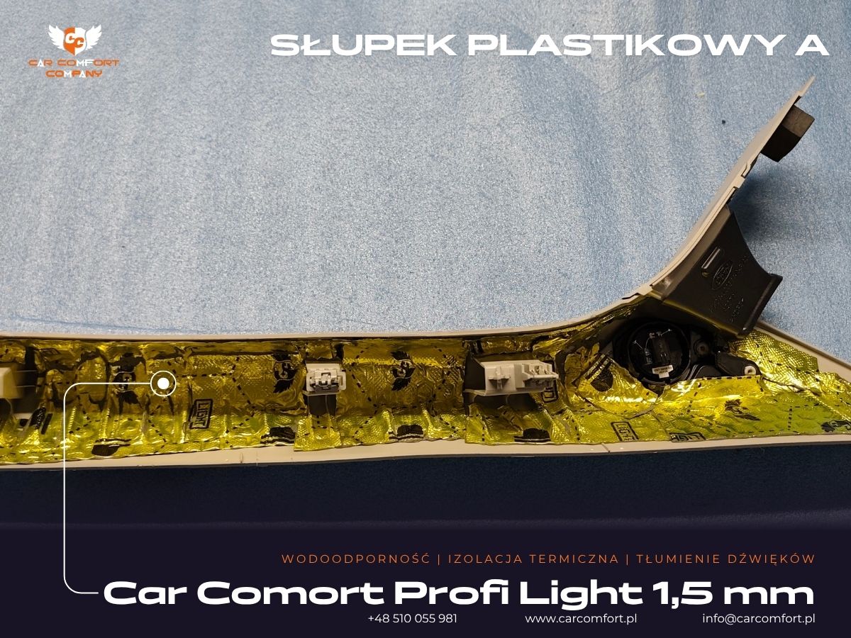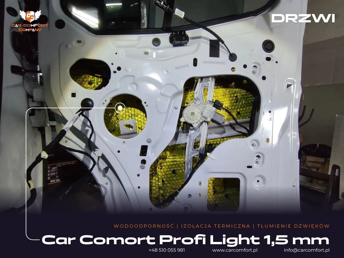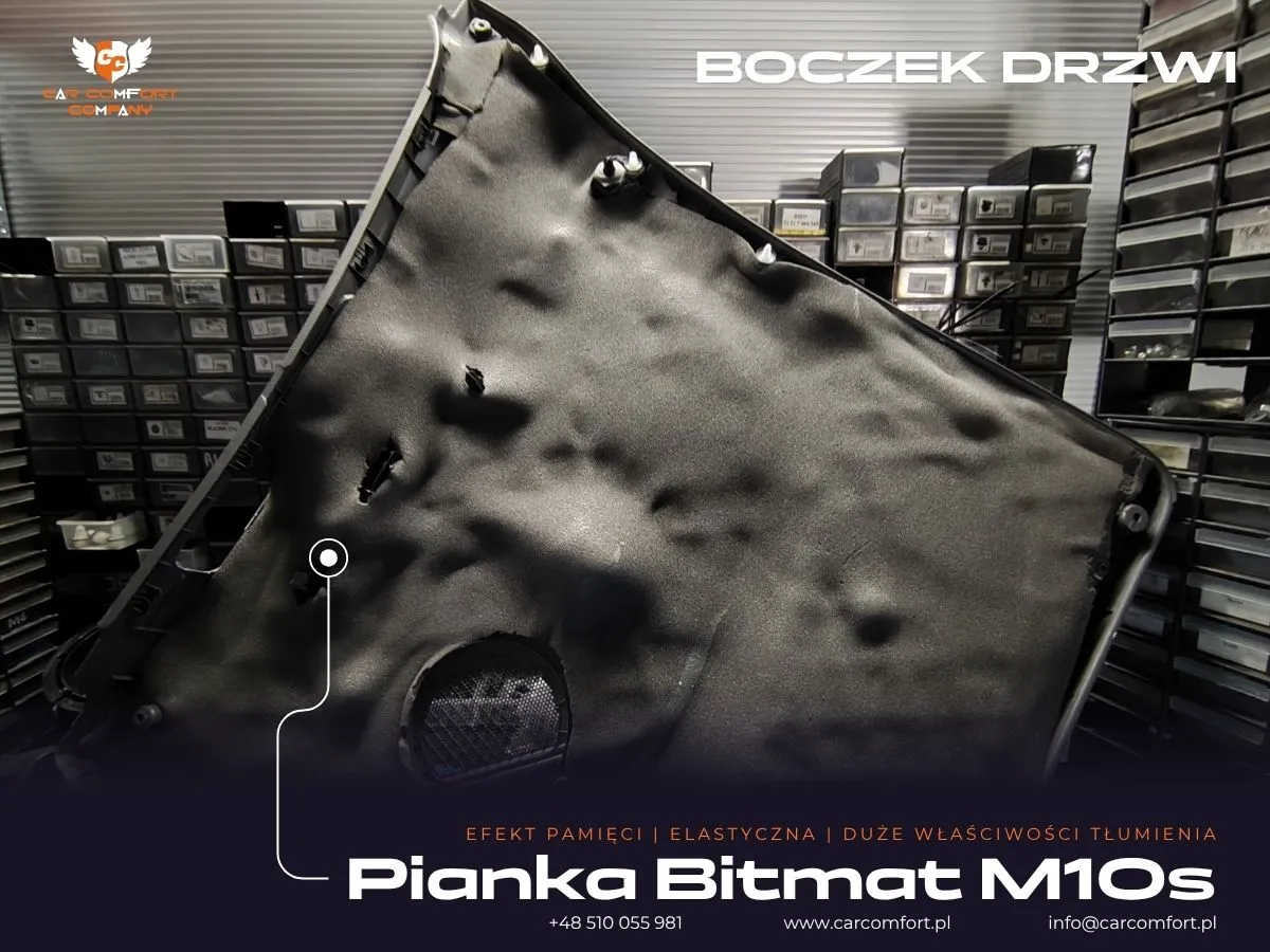 - Drzwi: Na blachę drzwi (wewnętrzną i zewnętrzną) zaaplikowano matę butylową Car Comfort Profi (prawdopodobnie 2,3mm lub 2,5mm) w celu tłumienia wibracji i usztywnienia konstrukcji. Na boczkach drzwi użyto pianki M10s Memory Foam 10mm, która doskonale absorbuje fale dźwiękowe i eliminuje rezonanse plastikowych paneli.