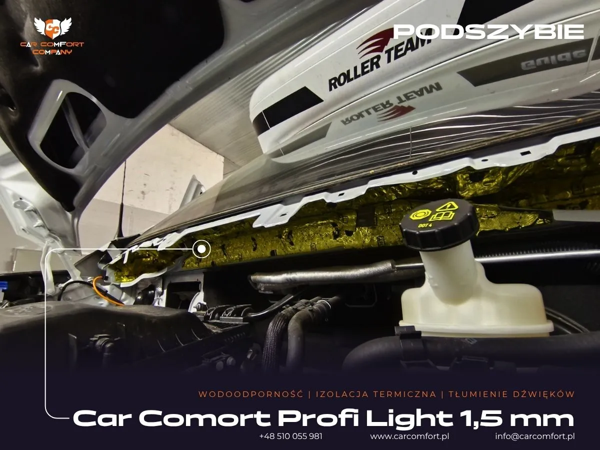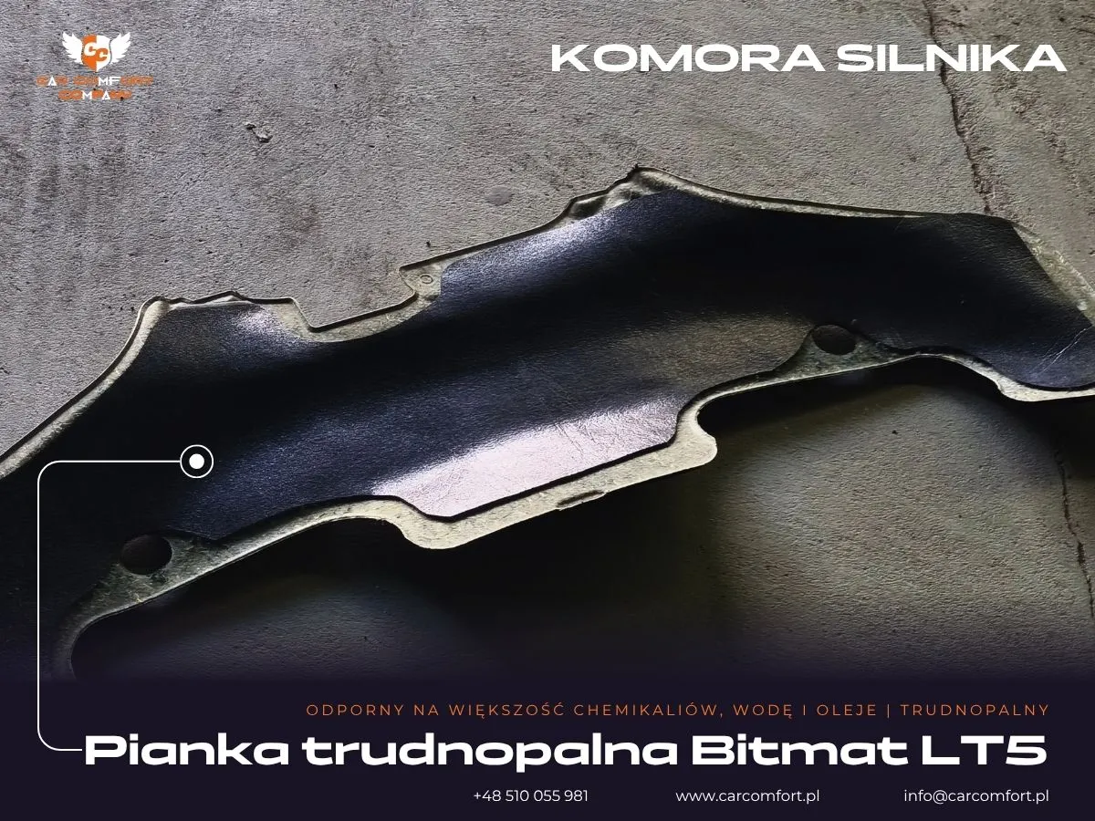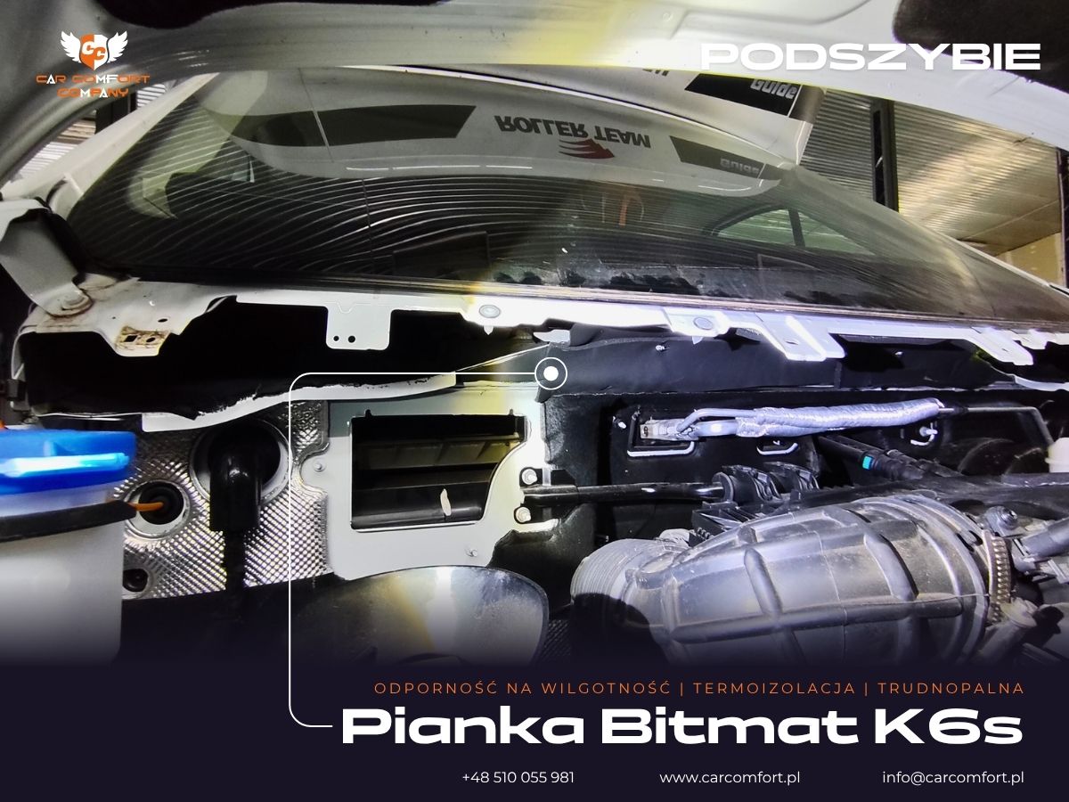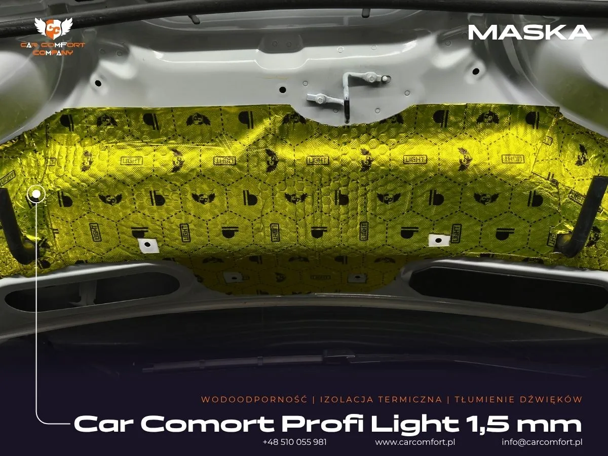 - Maska: Na blachę maski nałożono matę Car Comfort Profi dla stłumienia wibracji. Jako drugą warstwę, dla pochłaniania hałasu z silnika i izolacji termicznej, użyto pianki K6s Pianka tłumiąca 6mm lub inny materiał termiczno-akustyczny (K6s doskonale sprawdza się jako ognioodporny izoaltor termiczny i akustyczny).