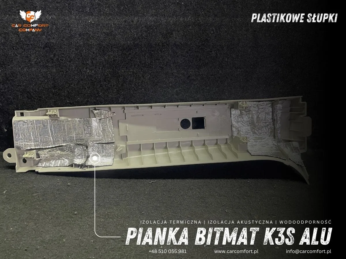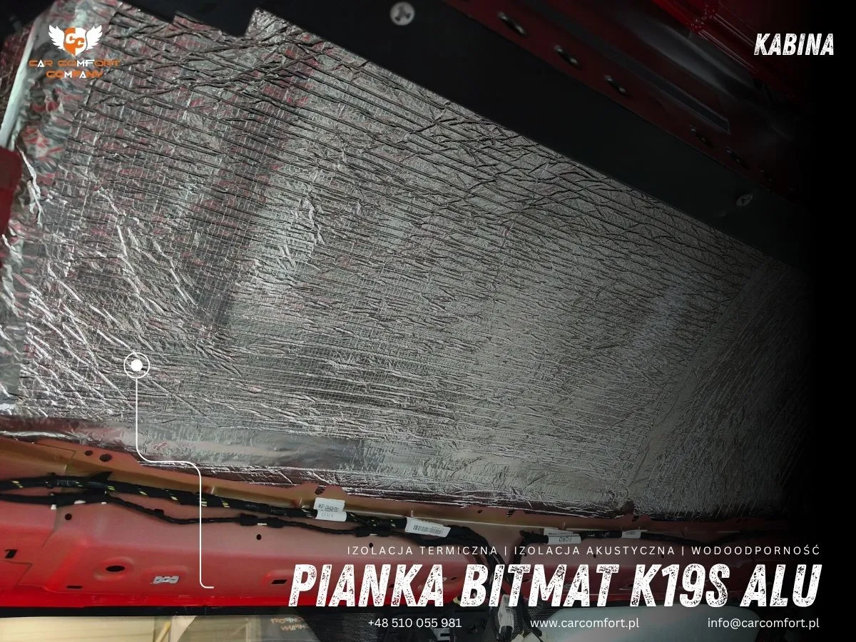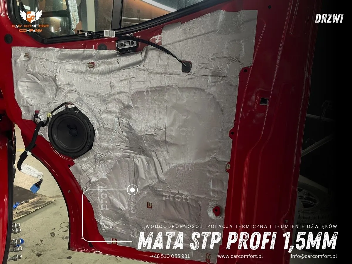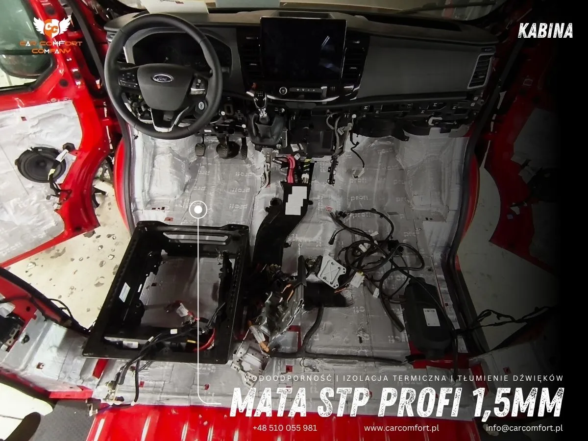 W Fordzie Transit L3 przeprowadzono kompleksowe wyciszenie całej kabiny oraz maski silnika. Do wyciszenia drzwi, słupków, boczków drzwi, plastikowych nadkoli i zewnętrznych nadkoli zastosowano StP Profi 1,5 mm jako pierwszą i trzecią warstwę (gdzie to było wymagane), oraz K3s ALU jako drugą warstwę. Uszczelki drzwi wzmocniono Sznur sealing cord. Wszystkie te materiały zostały użyte do stworzenia wielowarstwowej bariery akustycznej. Ponadto, wykonano montaż akumulatorów Webasto, zapewniających niezawodne zasilanie dla systemu ogrzewania postojowego. Całość uzupełniło profesjonalne przyciemnianie szyb, które zwiększyło komfort termiczny oraz prywatność.