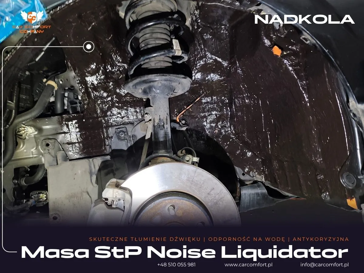 - Nadkola Metalowe (Wygłuszenie Wibracyjne i Antykorozyjne): Na metalową część nadkola zaaplikowano StP Noise Liquidator A+B. Jest to innowacyjna, płynna masa tłumiąca, która po utwardzeniu tworzy grubą, elastyczną i szczelną powłokę. Noise Liquidator działa jako skuteczny wibroizolator, niweluje drgania metalu i jednocześnie zapewnia doskonałą ochronę antykorozyjną.