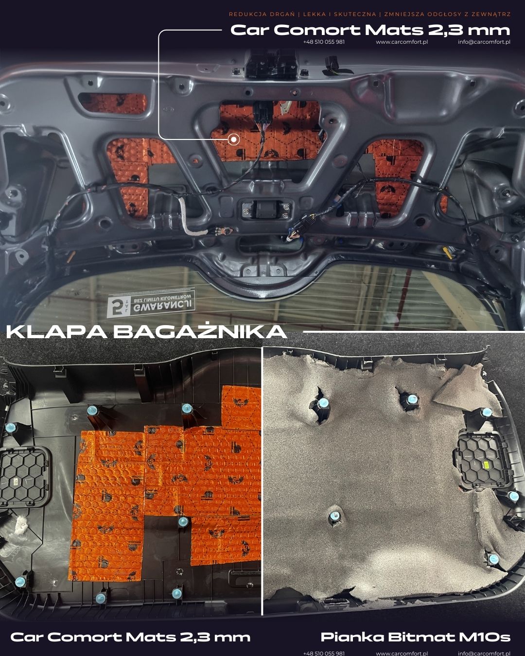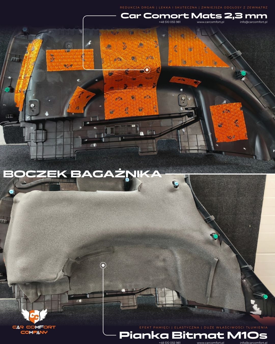 Boczki bagażnika otrzymały matę Car Comfort Mats 2,3 mm oraz piankę Bitmat M10s, co ogranicza rezonanse i poprawia komfort akustyczny tylnej części pojazdu.