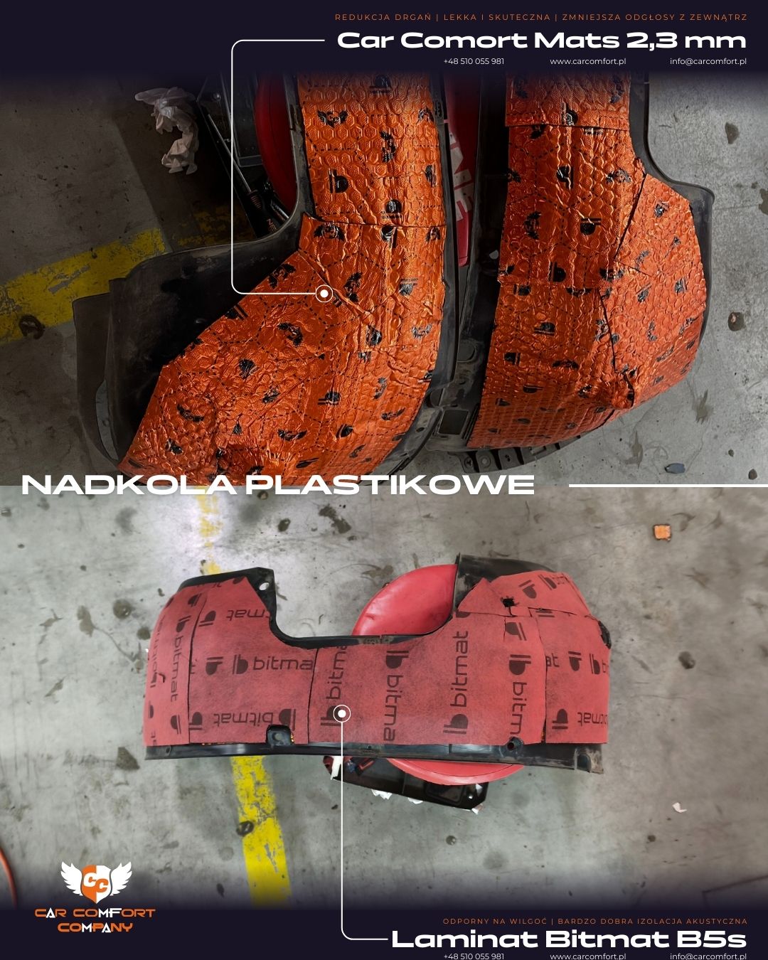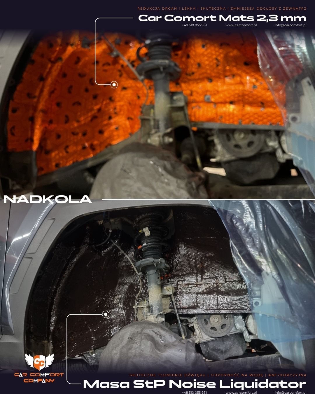 Nadkola zostały zabezpieczone matą butylową Car Comfort Mats 2,3 mm, a jako warstwę tłumiącą zastosowano StP Noise Liquidator, który skutecznie redukuje drgania i hałas toczenia przenoszony z nawierzchni.