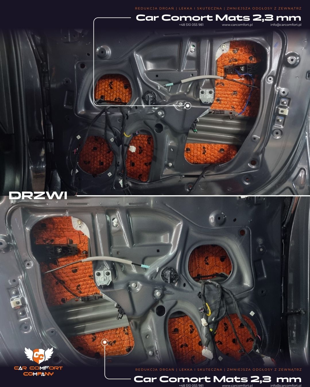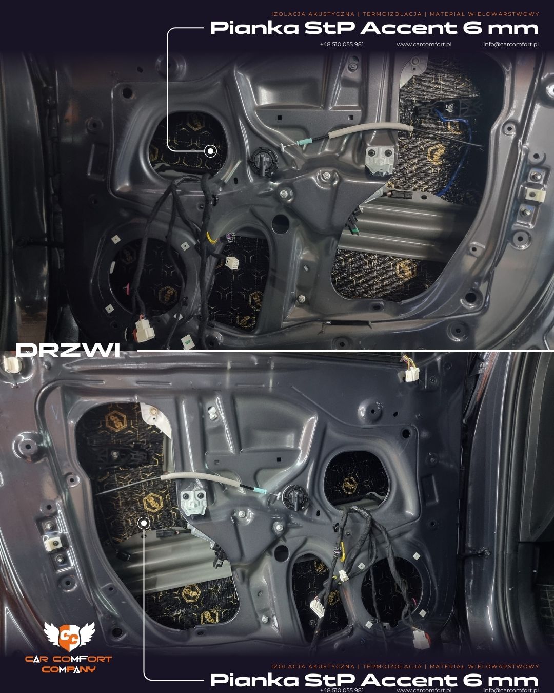 Drzwi wyciszono w układzie trójwarstwowym. Pierwszą i trzecią warstwę stanowi mata butylowa Car Comfort Mats 2,3 mm, która usztywnia poszycie i skutecznie tłumi drgania blachy. Warstwę środkową tworzy StP Accent, odpowiadający za pochłanianie fal dźwiękowych i redukcję rezonansów.
