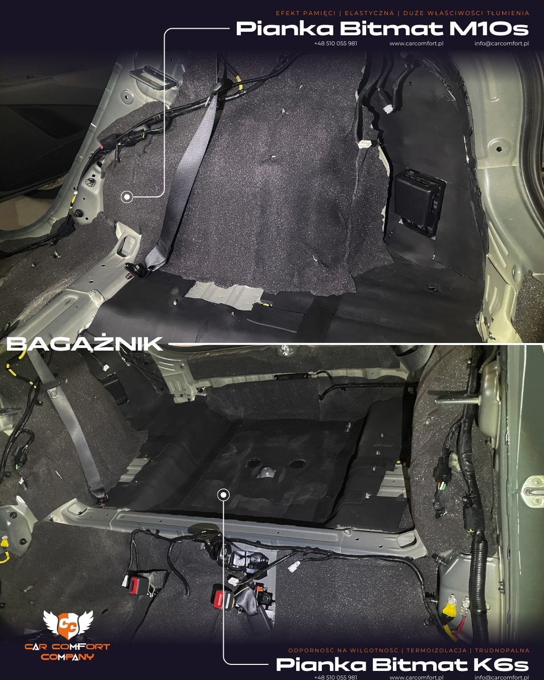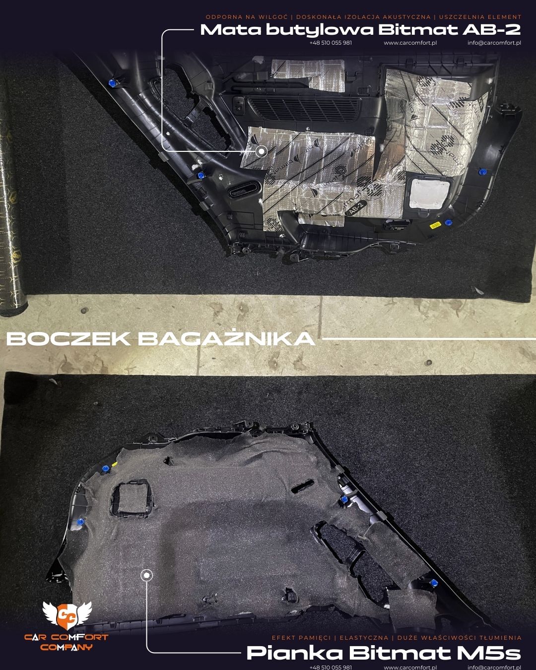Boczki bagażnika zostały wyciszone matą Bitmat AB-2 oraz pianką Bitmat M5s, która eliminuje rezonanse plastikowych elementów i poprawia komfort akustyczny w tylnej części wnętrza.