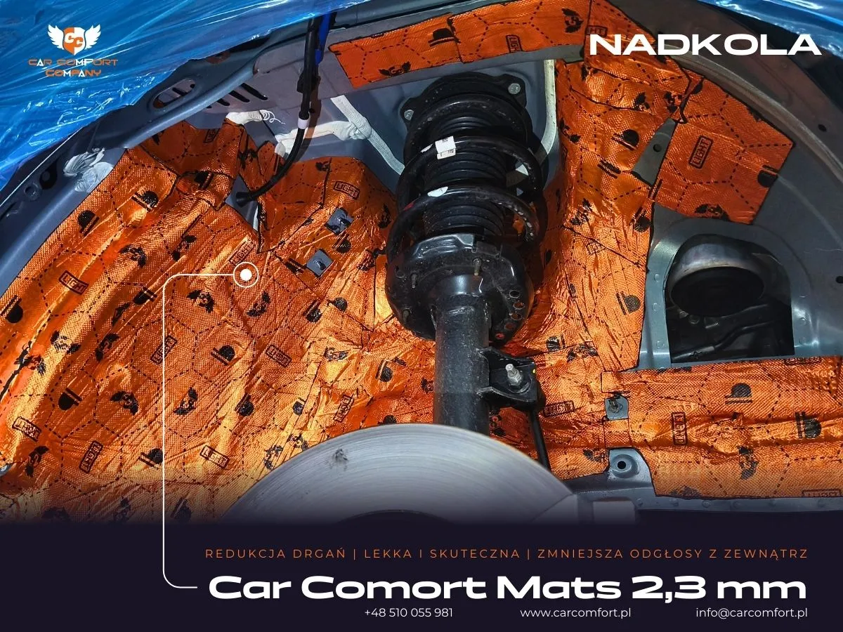 - Nadkola metalowe: Jako pierwszą warstwę tłumiącą wibracje zaaplikowano matę butylową Car Comfort Mats. Następnie, dla optymalnego efektu wygłuszenia i utwardzenia powierzchni, zastosowano StP Noise Liquidator – innowacyjny preparat w płynie.