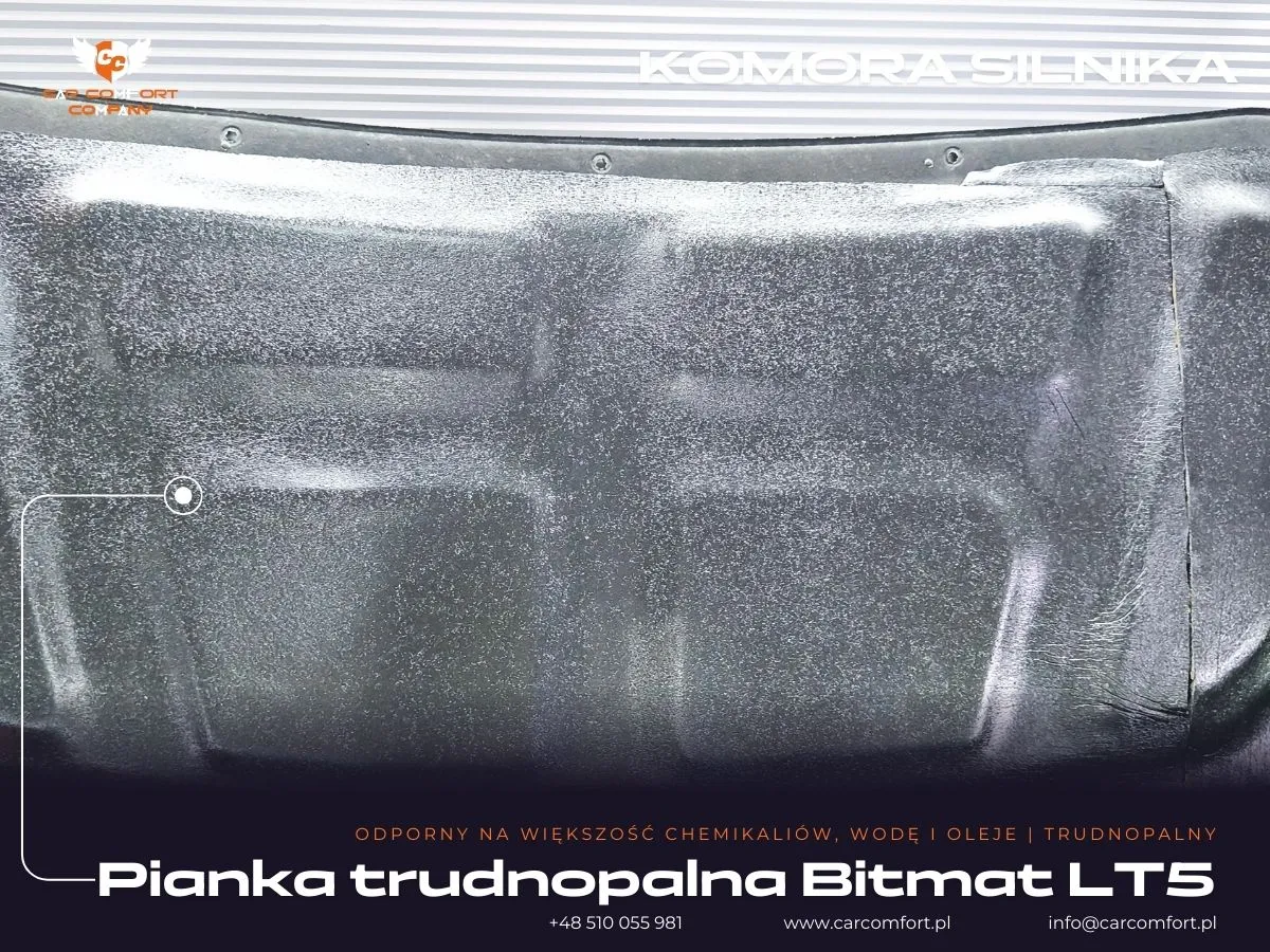 - Maska silnika: Na blachę maski nałożono matę Car Comfort Mats w celu stłumienia wibracji. Jako drugą warstwę, użyto pianki trudnopalanej Bitmat LT5. Ta specjalistyczna pianka absorbuje hałas silnika, jednocześnie izolując termicznie.