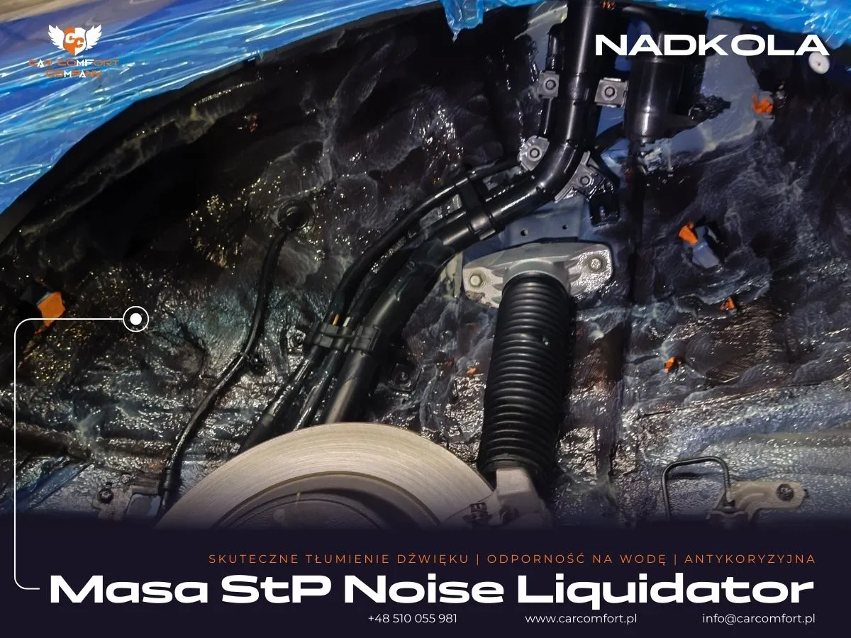 - Następnie, jako drugą warstwę, użyto StP Noise Liquidator A+B. Jest to płynna masa tłumiąca, która po utwardzeniu tworzy grubą, trwałą i szczelną powłokę. Działa jako wibroizolator, antykorozyjny środek ochronny i bariera przed uderzeniami kamieni.