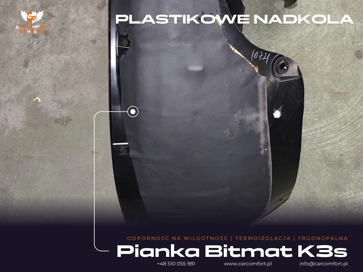- Na wewnętrzną stronę plastikowych osłon nadkoli (bądź filców) zastosowano Bitmat K3s Piankę tłumiącą 3mm. Jest to lekka pianka kauczukowa o strukturze zamkniętych komórek, która doskonale izoluje akustycznie i termicznie. Zapobiega rezonansom plastiku i blokuje hałas drogowy przenoszony przez osłonę.