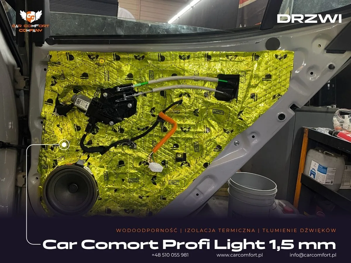 Do wyciszenia Kii Stinger GT wykorzystano połączenie wysokiej jakości materiałów. Drzwi otrzymały trzy warstwy: Car Comfort Profi 1,5 mm (pierwsza i trzecia) oraz piankę StP Accent 6 mm (druga). Boczki drzwiowe wygłuszono matą Car Comfort Profi 1,5 mm i pianką Bitmat M10s. Metalowe nadkola pokryto matą Car Comfort Profi 1,5 mm i masą StP Noise Liquidator, natomiast plastikowe osłony nadkoli matą Car Comfort Profi 1,5 mm i pianką Bitmat B5s. Bagażnik również wyciszono matą Car Comfort Profi 1,5 mm oraz pianką Bitmat B5s.