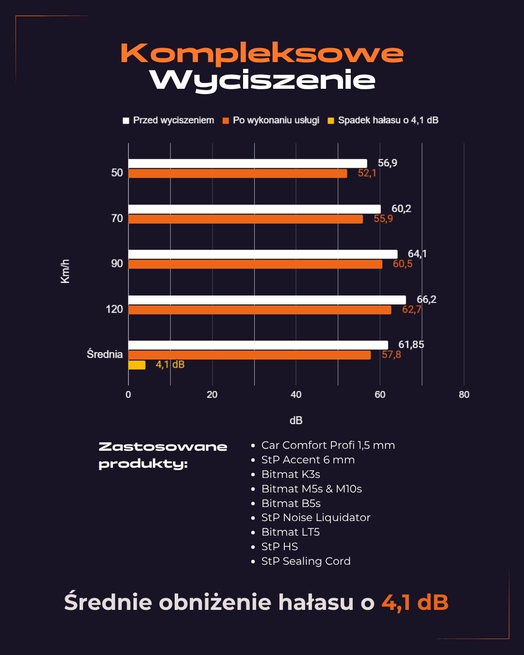 Efektem całej realizacji jest redukcja hałasu o aż 4,1 dB, co znacząco poprawia komfort jazdy zarówno na asfalcie, jak i w terenie.
