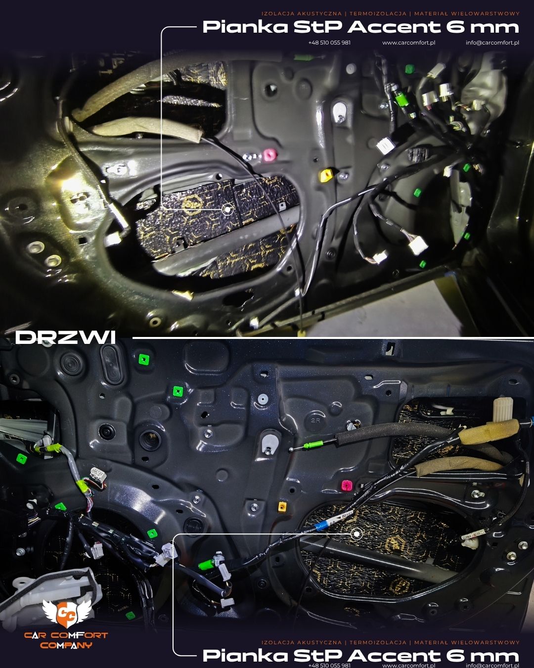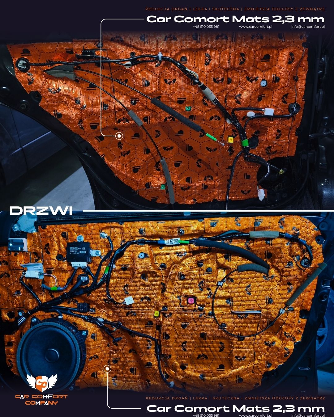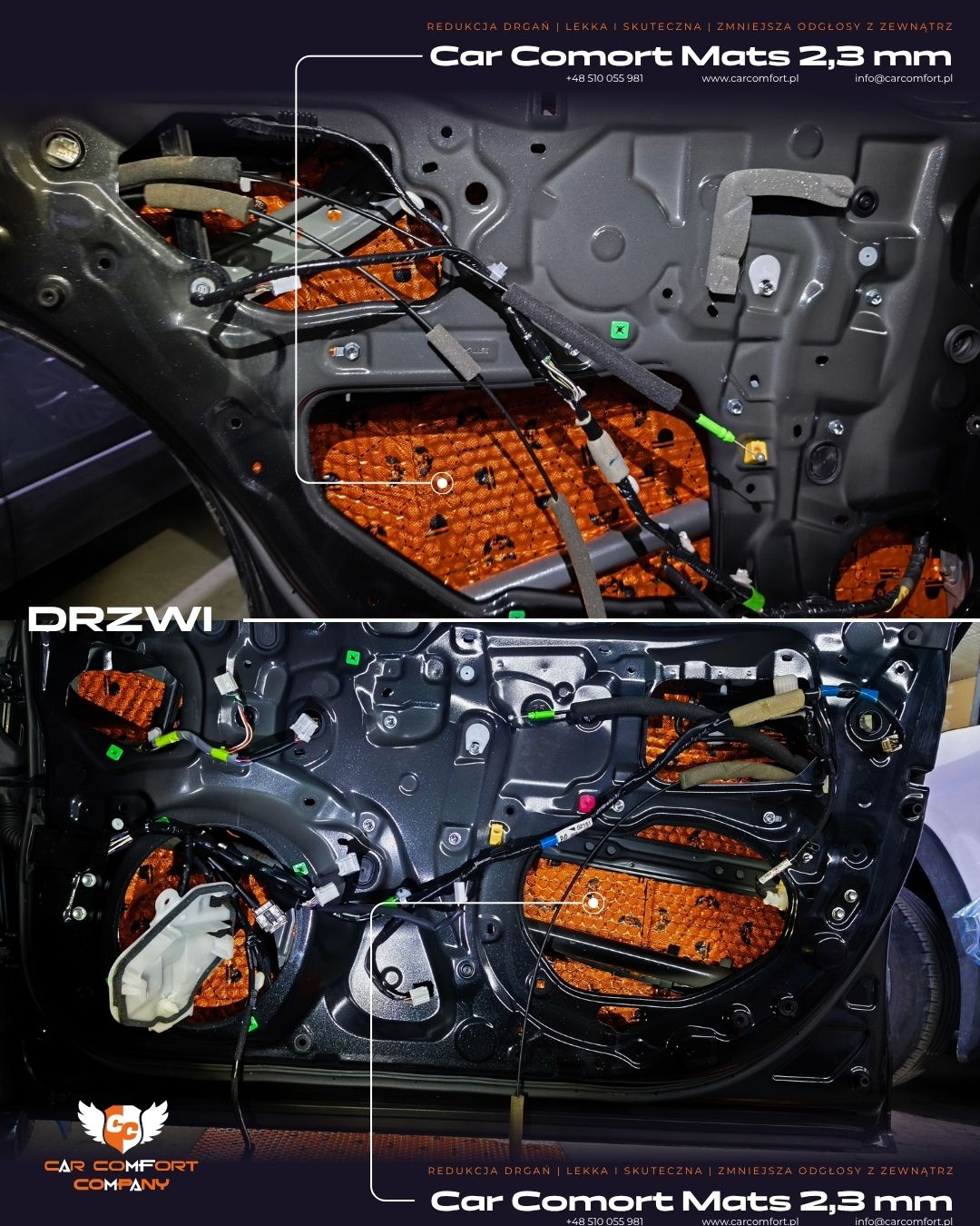 Drzwi zostały wyciszone matą Car Comfort Mats 2,3 mm, która skutecznie tłumi drgania blachy.