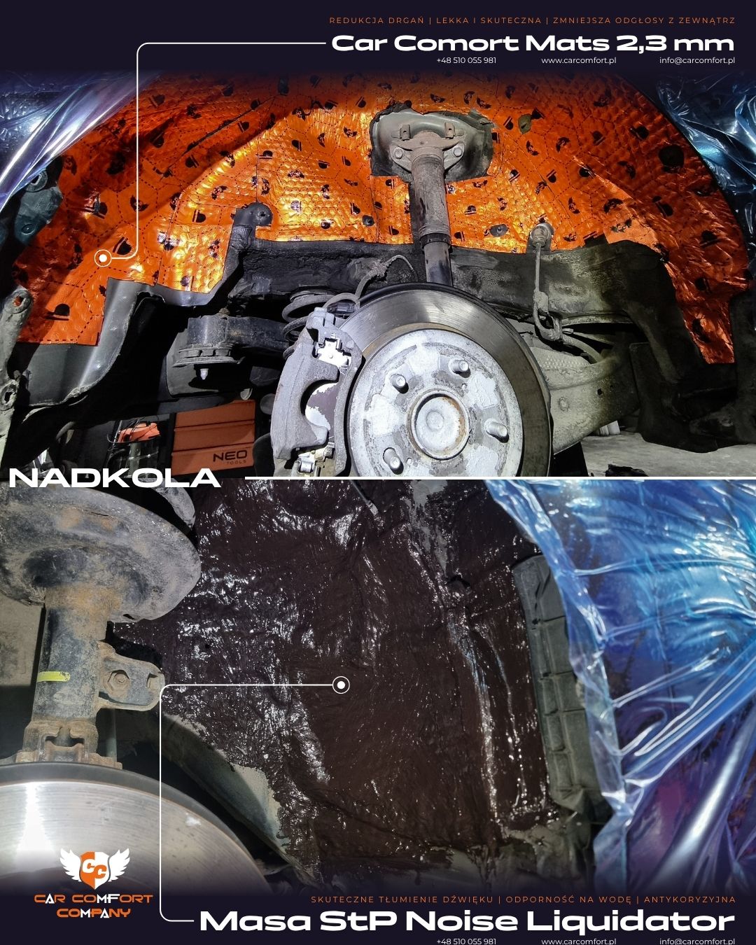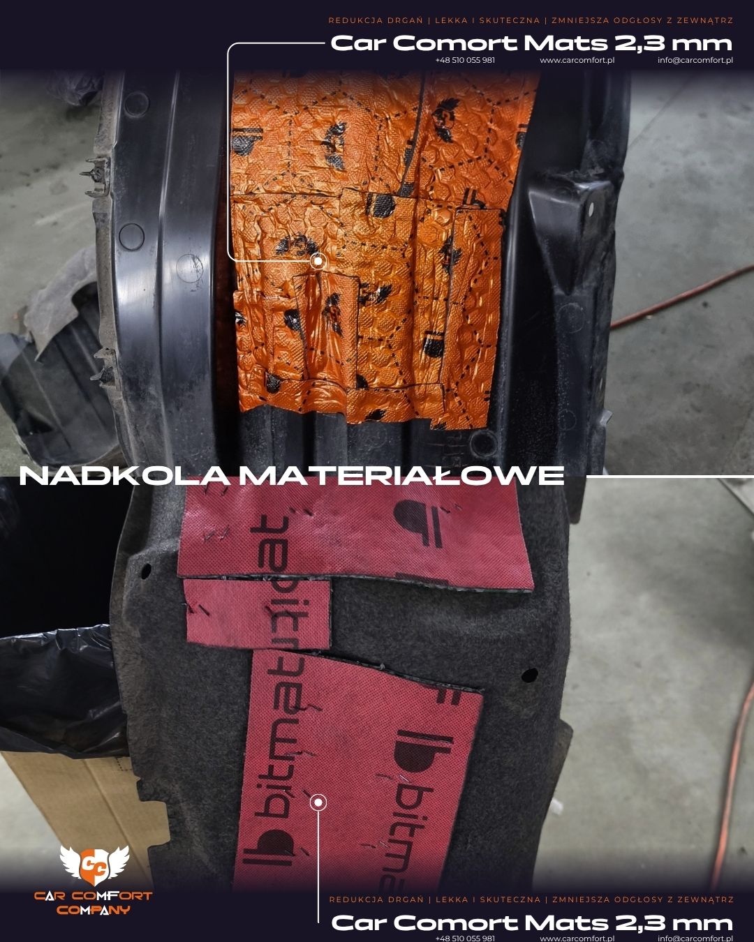 Nadkola zostały wyciszone przy użyciu Car Comfort Mats 2,3 mm oraz laminatu Bitmat B5s, który dobrze sprawdza się w strefach narażonych na wilgoć.