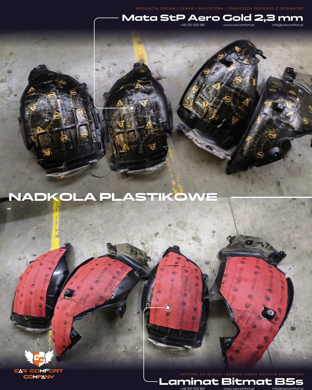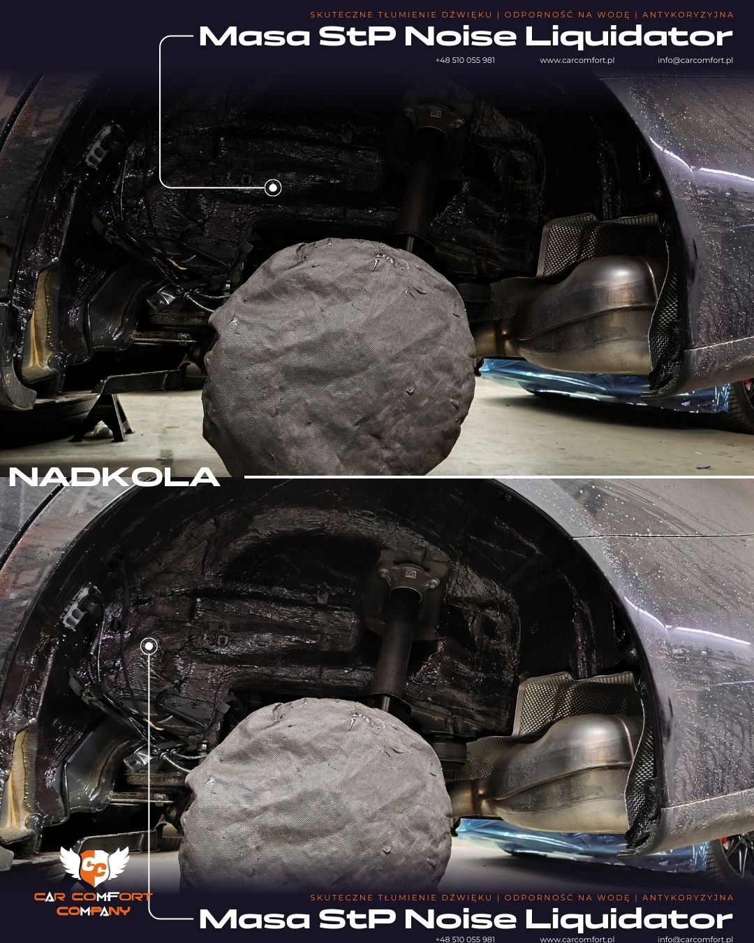 Nadkola Mercedesa E Klasy zostały wyciszone w trzech warstwach starannie dobranych materiałów akustycznych. Jako pierwsza warstwa posłużyła mata butylowa StP Aero Gold 2,3mm – jeden z lepszych materiałów butylowych w swojej klasie, doskonale tłumiący wibracje blachy nadkola. Drugą warstwę stanowi StP Noise Liquidator A+B 1kg – płynny tłumik akustyczny aplikowany natryskiwowo, który wypełnia wszystkie zakamarki nadkola niedostępne dla mat. Całość uzupełnia Bitmat B5s 5mm jako trzecia warstwa tłumiąca, zamykająca konstrukcję i pochłaniająca resztki hałasu od kół i zawieszenia.