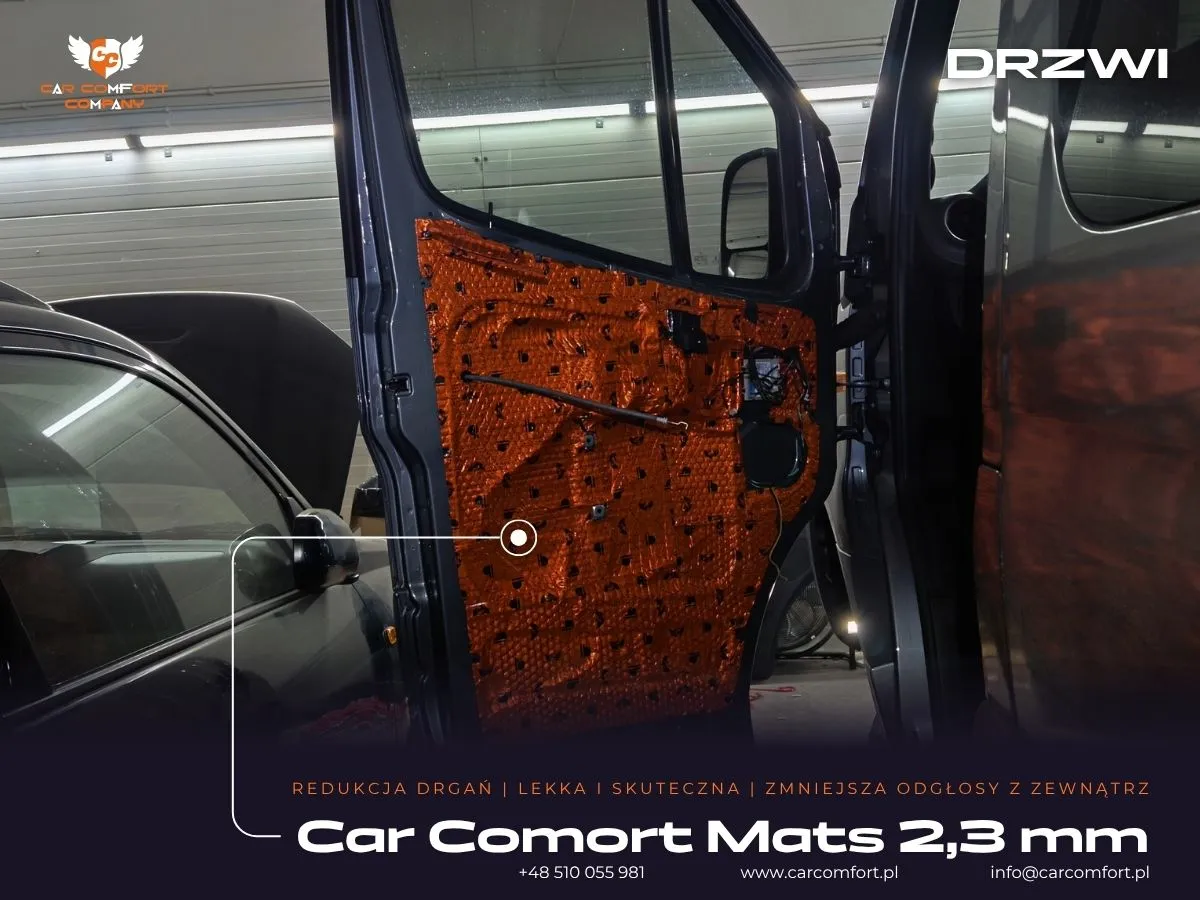 W Mercedesie Sprinter skupiliśmy się na szczegółowym wyciszeniu drzwi, które są kluczowym źródłem przenikania hałasu do kabiny. Zarówno drzwi normalne, jak i przesuwne, zostały poddane wielowarstwowemu wyciszeniu. Na wewnętrzną stronę blachy drzwiowej zastosowano matę butylową Car Comfort Mats, która skutecznie tłumi wibracje i rezonanse. Następnie, na zewnętrzną blachę drzwi, położyliśmy kolejną warstwę maty StP Alum (dla drzwi przesuwnych) lub Car Comfort Mats (dla drzwi normalnych), co zwiększyło efektywność izolacji akustycznej. Boczek drzwi również został starannie wyciszony – po nałożeniu maty Car Comfort Mats, jako warstwę uzupełniającą, zastosowano piankę Bitmat M10s, która doskonale pochłania fale dźwiękowe i izoluje akustycznie.