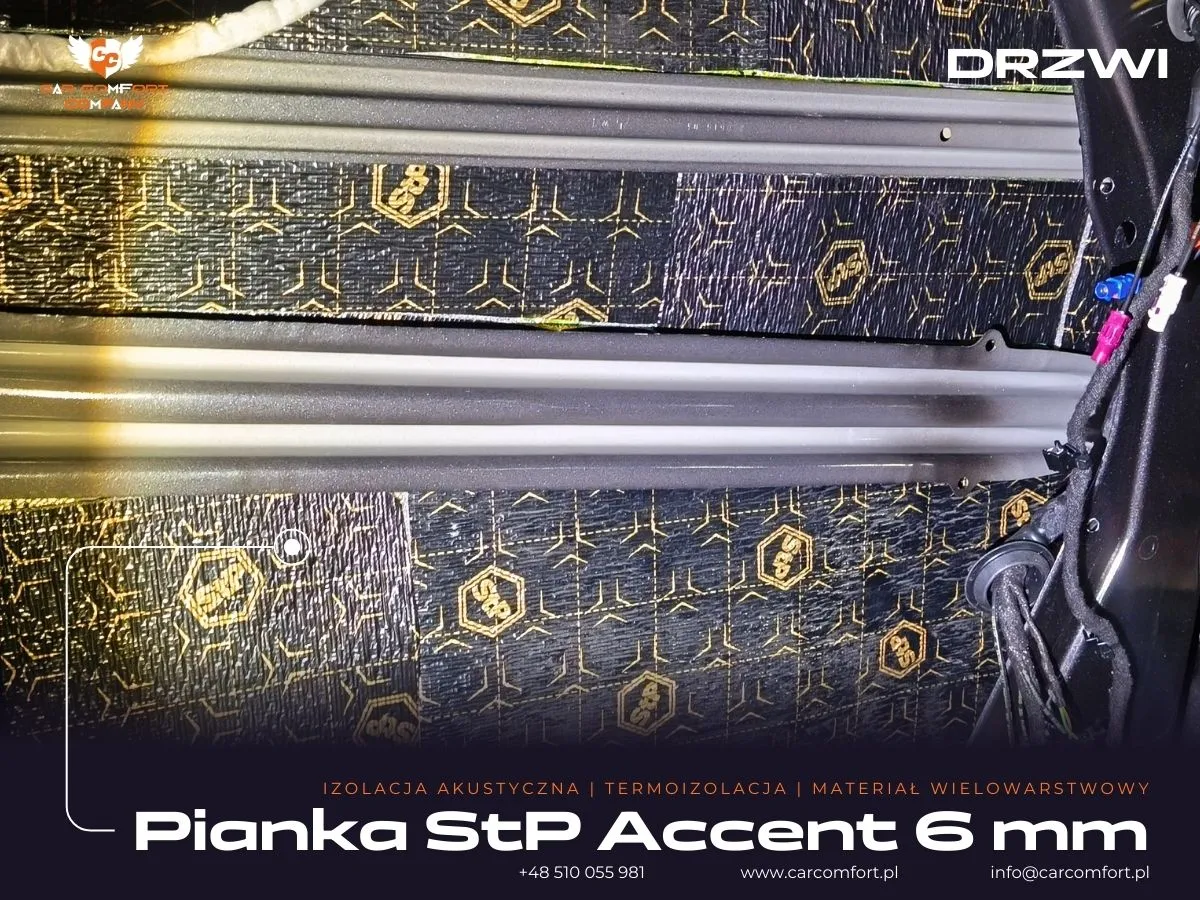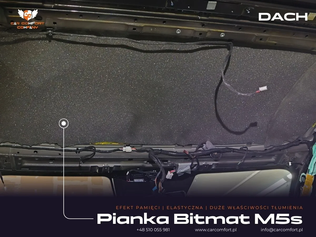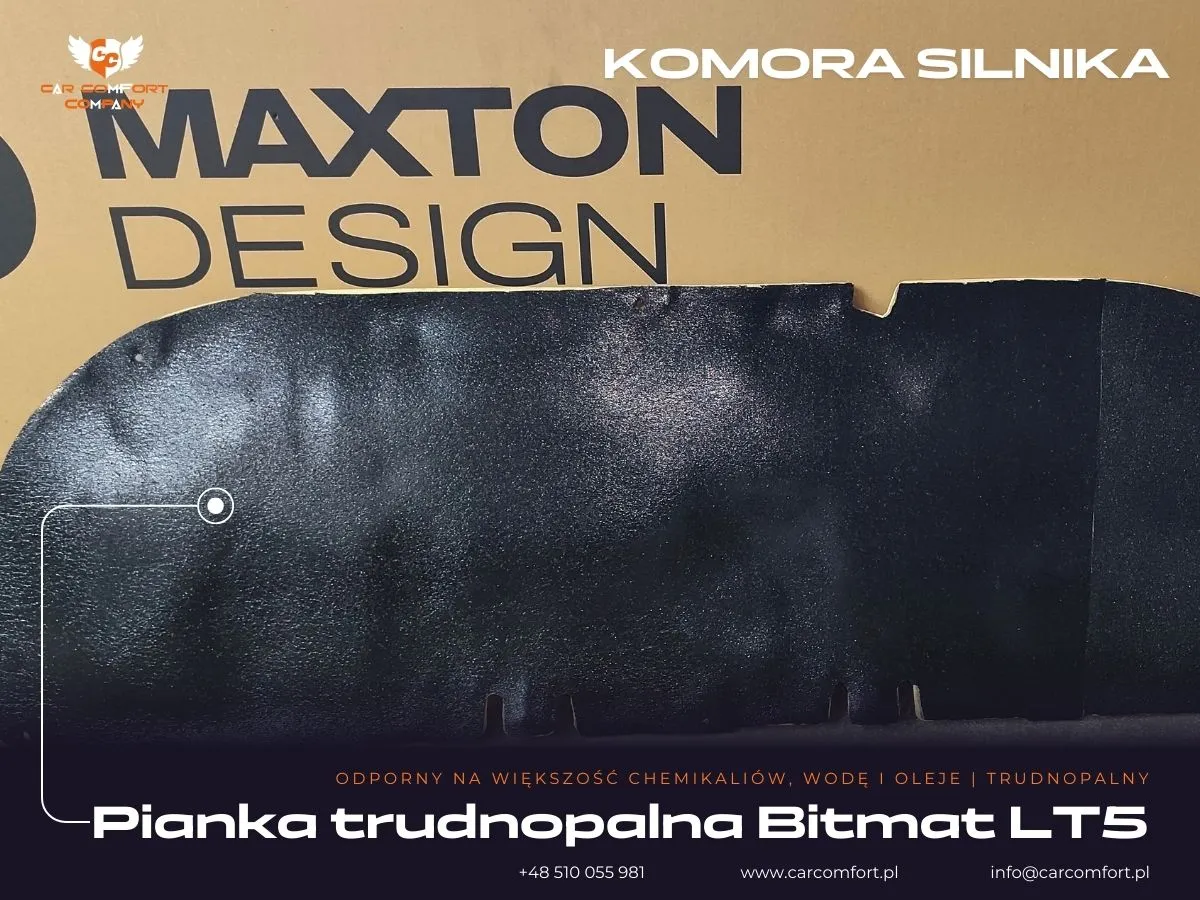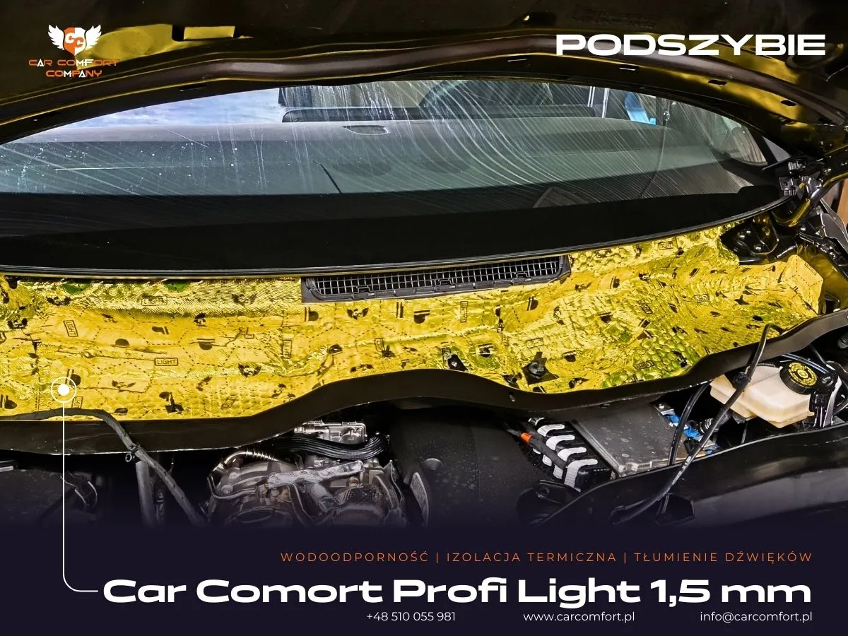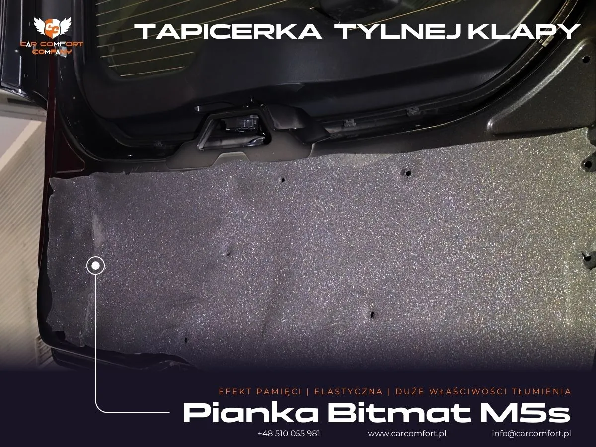 Aby zapewnić kompleksową ciszę, wyciszyliśmy również maskę silnika, nakładając matę Car Comfort Profi 1,5mm i piankę StP LT5. Na podszybiu zastosowano Car Comfort Profi 1,5mm oraz piankę Bitmat K6s, co znacząco obniżyło poziom hałasu z drogi i silnika. Tylna klapa również otrzymała dwuwarstwowe wyciszenie z Car Comfort Profi 1,5mm i Bitmat M10s.