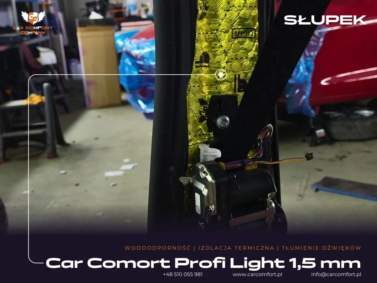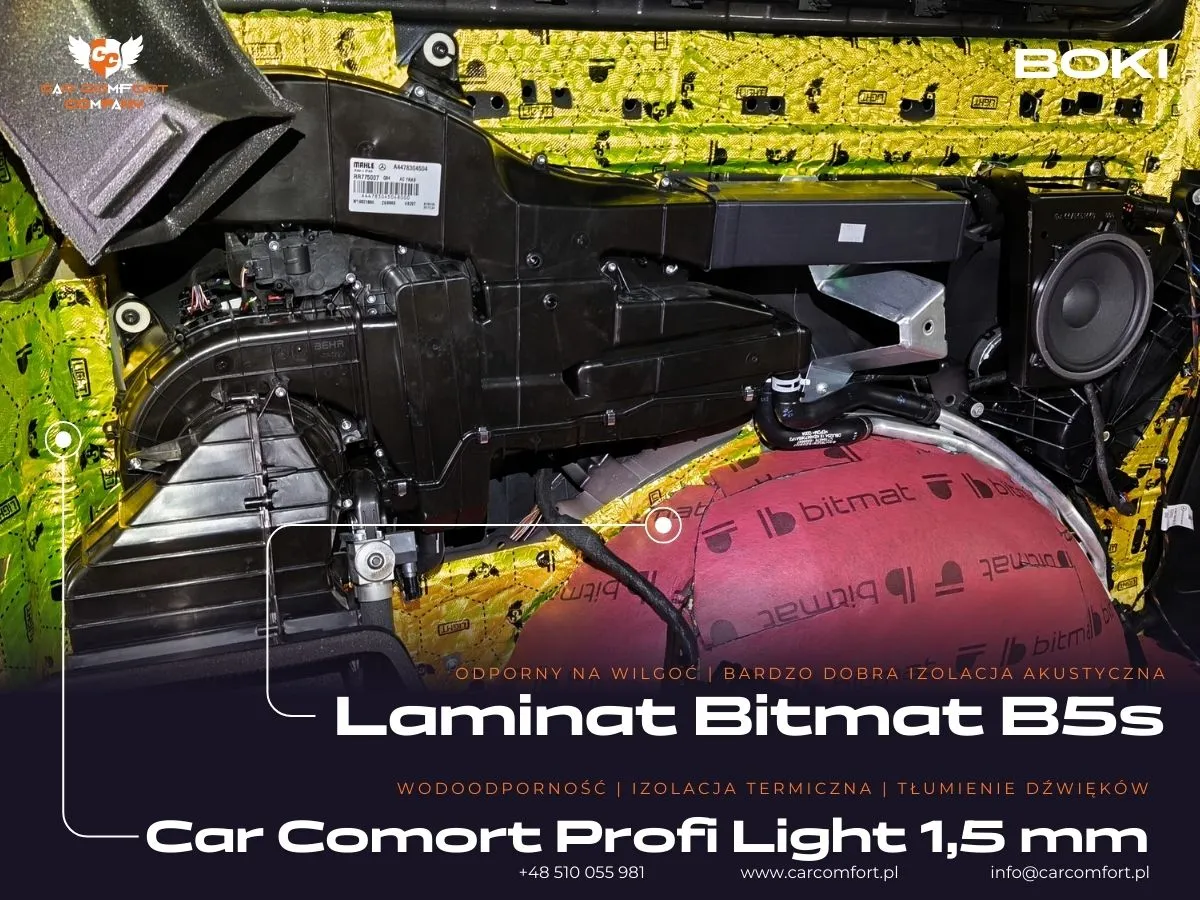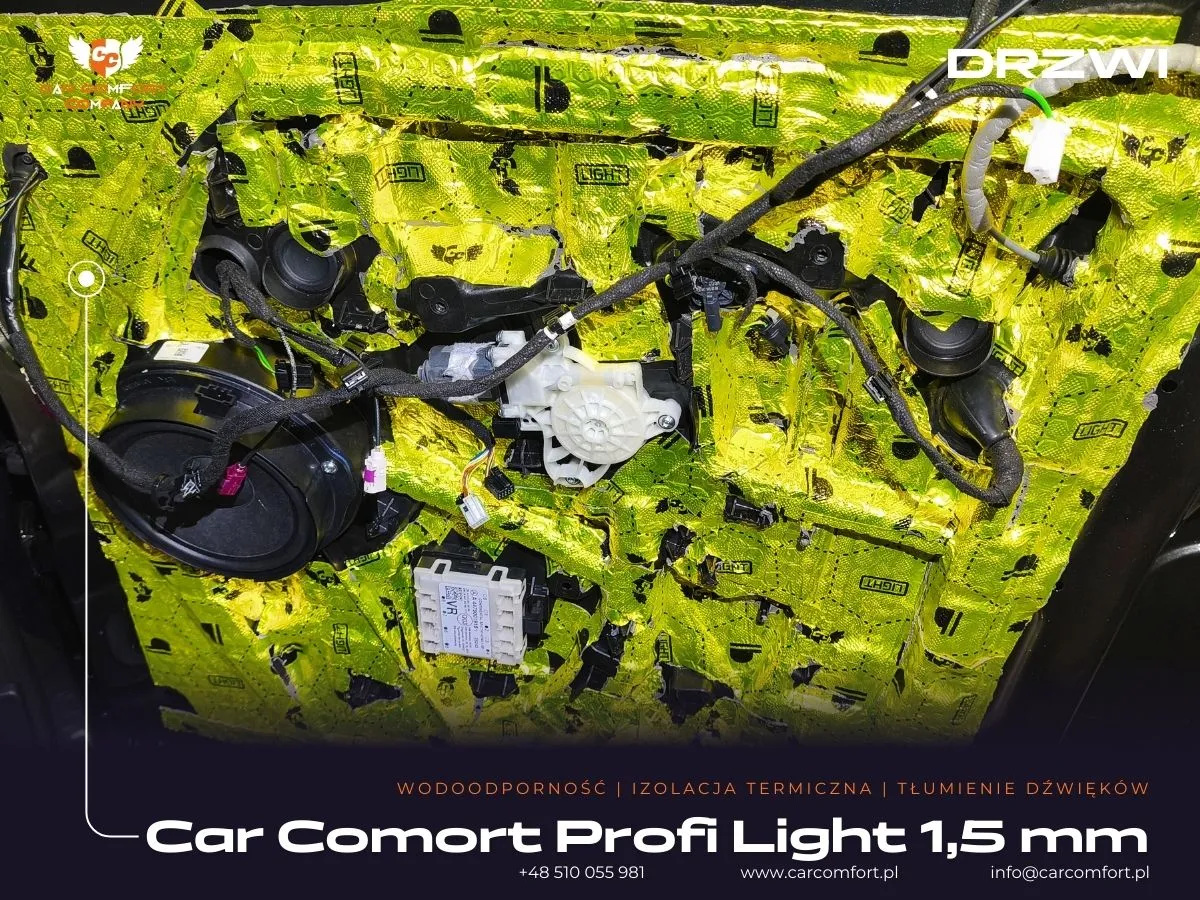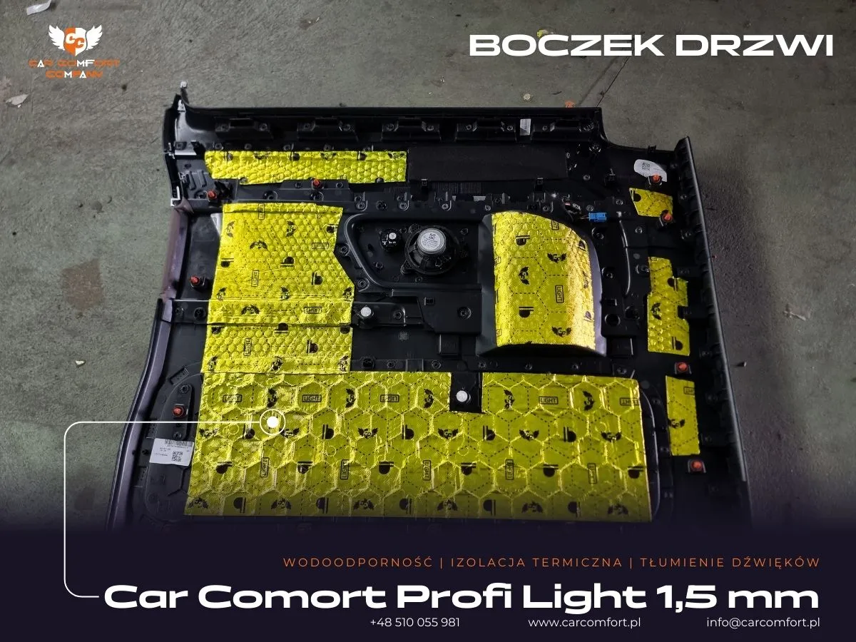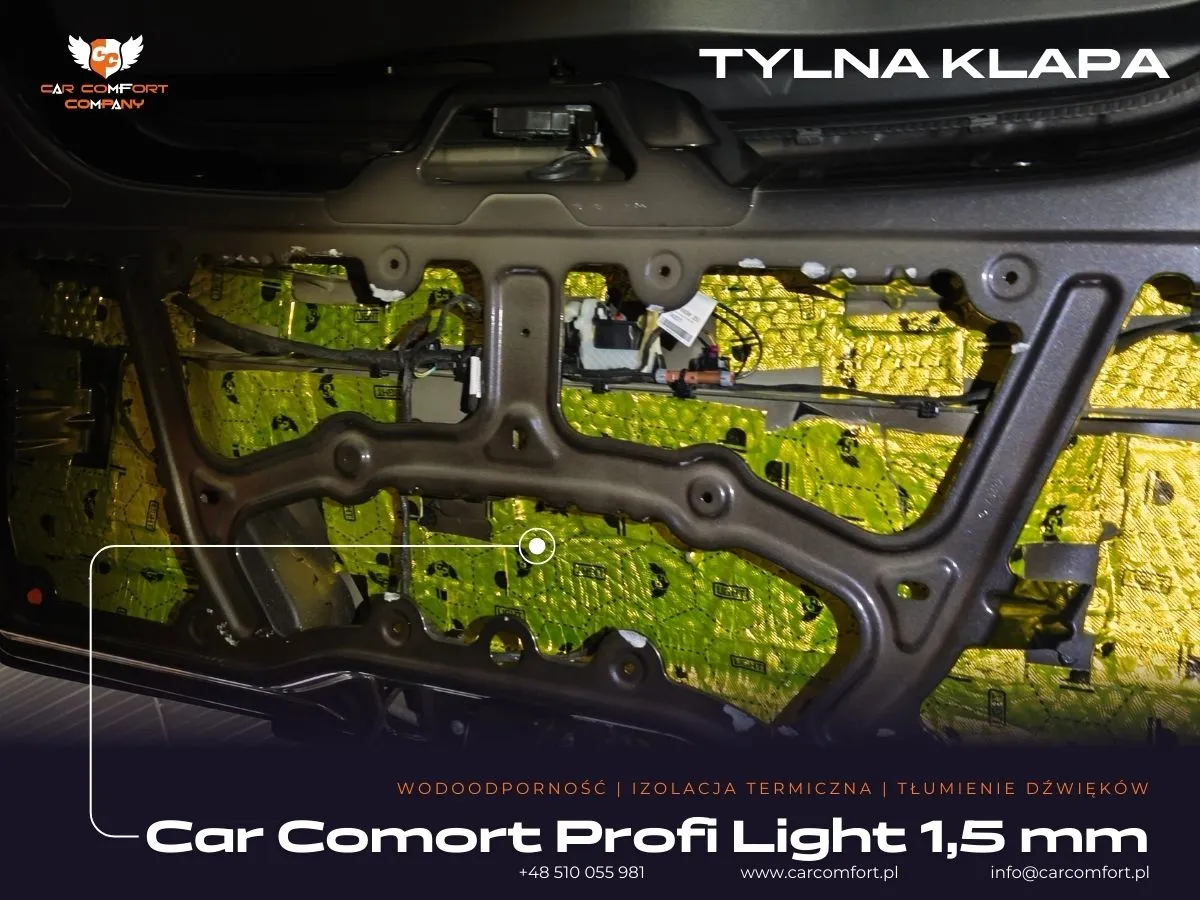 Aby zapewnić kompleksową ciszę, wyciszyliśmy również maskę silnika, nakładając matę Car Comfort Profi 1,5mm i piankę StP LT5. Na podszybiu zastosowano Car Comfort Profi 1,5mm oraz piankę Bitmat K6s, co znacząco obniżyło poziom hałasu z drogi i silnika. Tylna klapa również otrzymała dwuwarstwowe wyciszenie z Car Comfort Profi 1,5mm i Bitmat M10s.