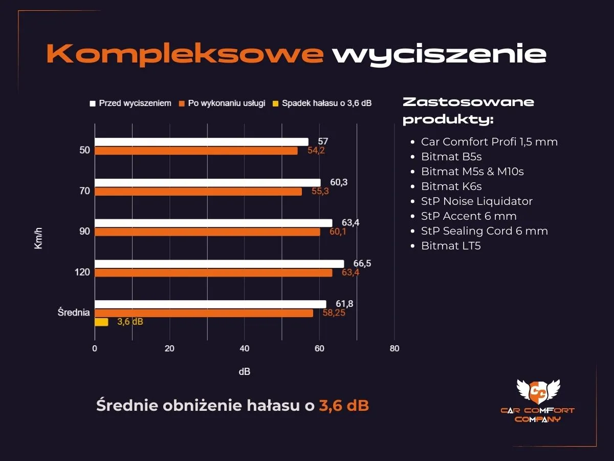 Dzięki zastosowaniu wysokiej jakości materiałów, takich jak Car Comfort Profi 1,5mm, StP Accent, Bitmat M10s, Bitmat B5s, StP LT5, Bitmat K6s oraz StP Noise Liquidator, a także profesjonalnej konserwacji i aplikacji folii PPF, Mercedes V-klasa osiągnął spektakularną redukcję hałasu o 3,6 dB. To znacząca różnica, która przekłada się na wyjątkowy komfort podróżowania, luksusową ciszę i optymalną ochronę na lata.