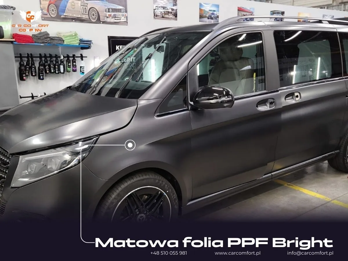 Poza kompleksowym wyciszeniem, wykonaliśmy konserwację podwozia z użyciem Waxoyl, co zapewnia długotrwałą ochronę antykorozyjną. Wisienką na torcie jest pełne oklejenie całego nadwozia matową folią PPF (Paint Protection Film), która chroni lakier przed zarysowaniami, odpryskami i szkodliwym działaniem czynników zewnętrznych.