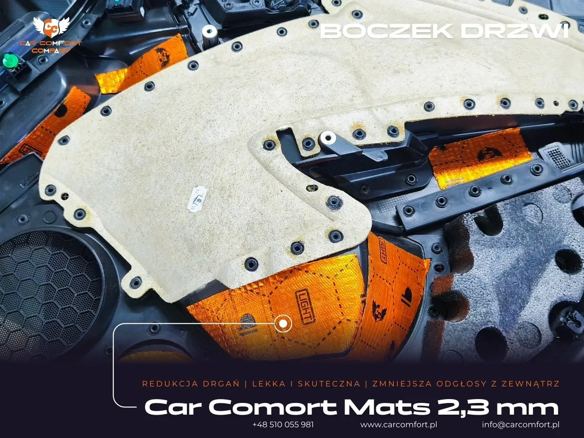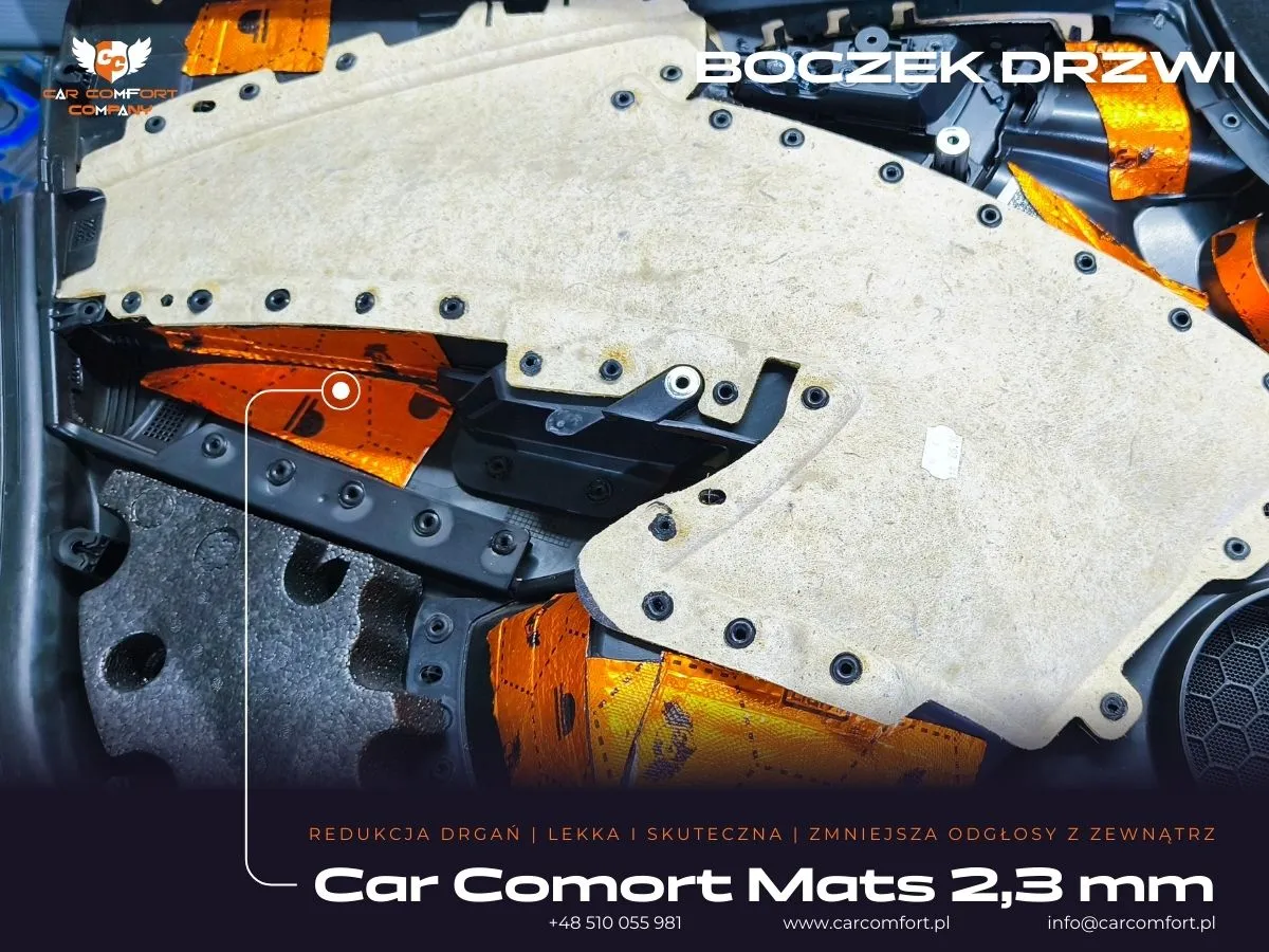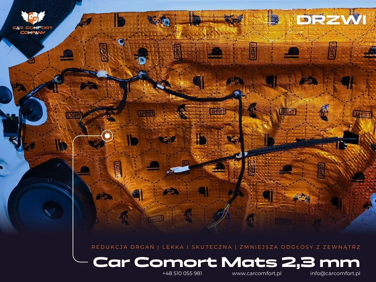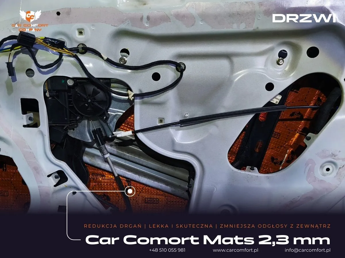 - Na zewnętrzną i wewnętrzną blachę drzwi zaaplikowano matę butylową Car Comfort Mats 2,3mm. Ta warstwa jest kluczowa w eliminacji drgań i rezonansów dużej powierzchni metalu, usztywniając konstrukcję i redukując buczenie. Uszczelnienie blachy wewnętrznej tworzy zamkniętą komorę, co poprawia odtwarzanie basu przez głośniki.
