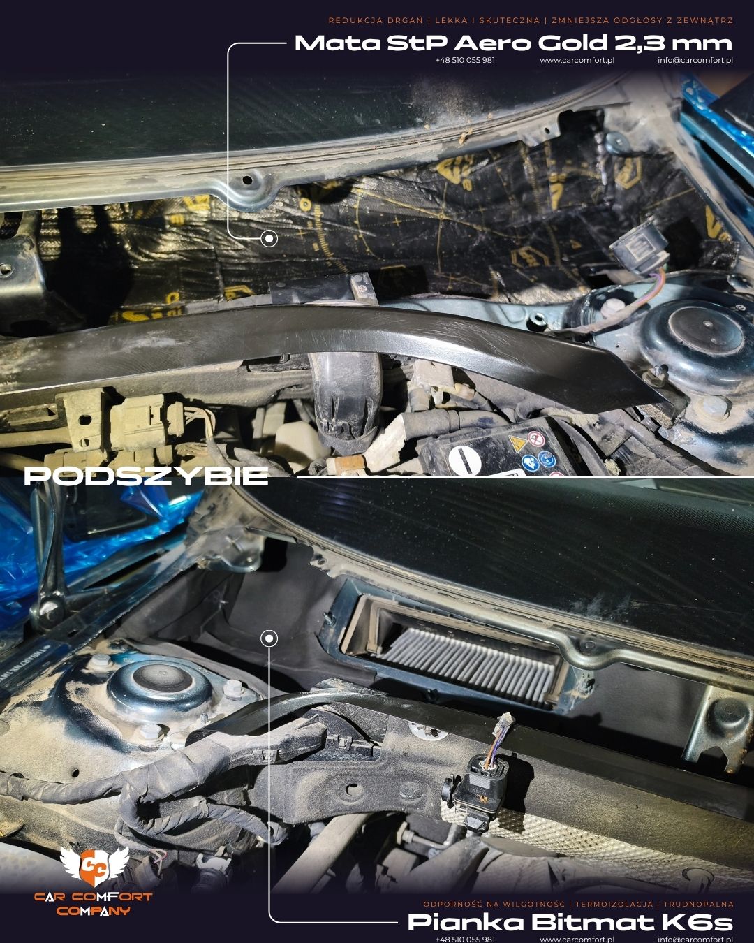 Podszybie zostało wyciszone przy użyciu StP Aero Gold 2,3 mm oraz pianki Bitmat K6s, która dobrze sprawdza się w strefach narażonych na wilgoć i zmienne warunki.