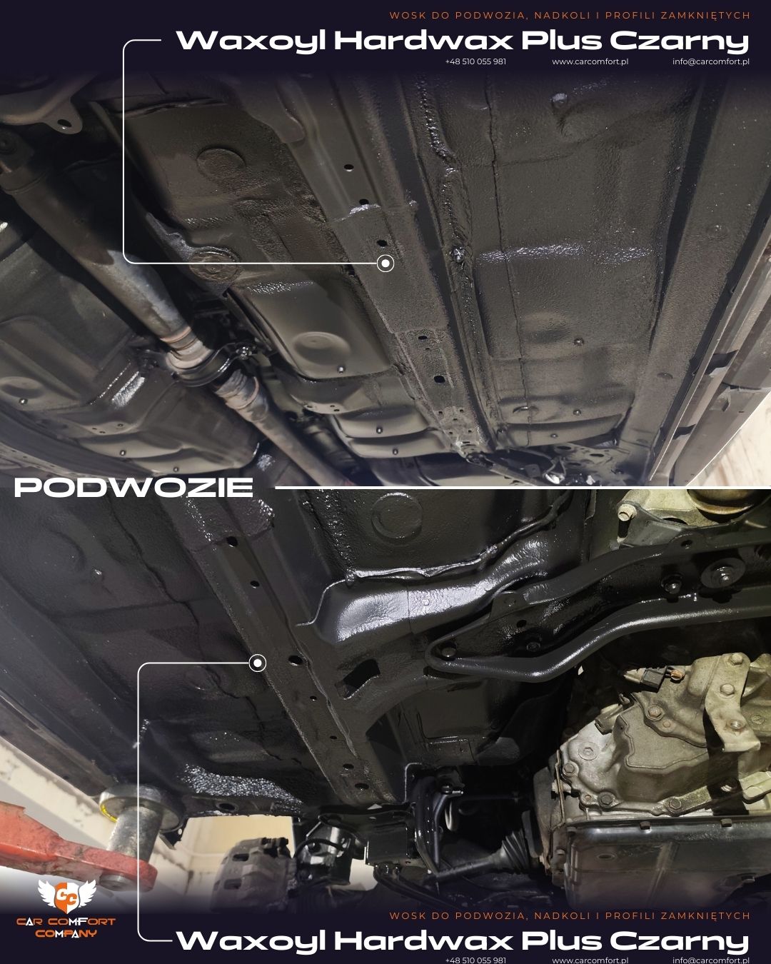 W Subaru Forester wykonaliśmy konserwację podwozia przy użyciu preparatu Waxoyl Hardwax Plus Czarny, który tworzy wytrzymałą powłokę ochronną zabezpieczającą elementy metalowe przed wilgocią, solą drogową oraz uszkodzeniami mechanicznymi.