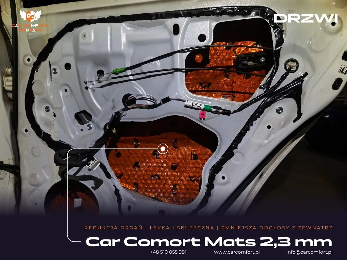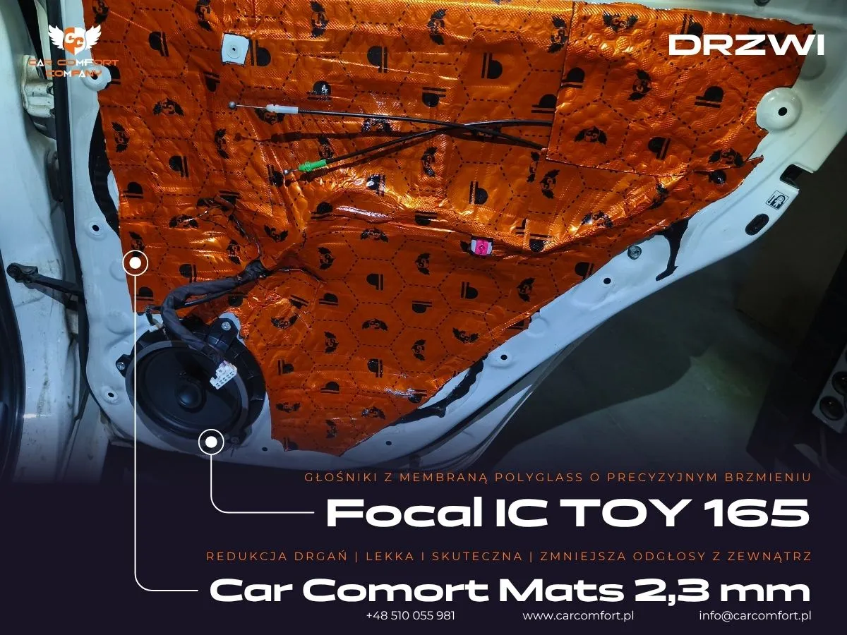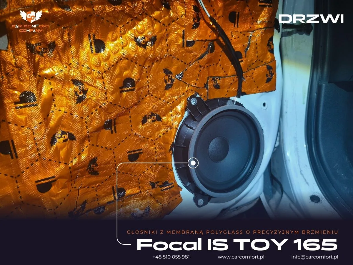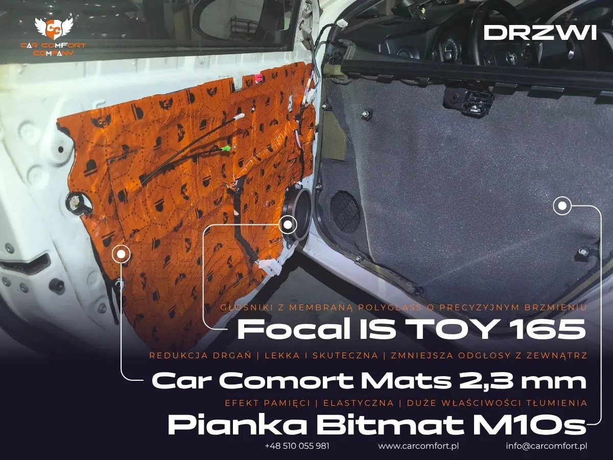 Do wyciszenia drzwi w Toyocie Auris zastosowano Car Comfort Mats 2,3mm jako pierwszą i drugą warstwę, co zapewnia skuteczną izolację wibracyjną i akustyczną. Boczki drzwi zostały wzmocnione dwiema warstwami: Car Comfort Mats 2,3mm oraz Bitmat M10s, co dodatkowo zwiększyło ich sztywność i ograniczyło rezonanse. Kluczowym elementem modernizacji było zamontowanie wysokiej jakości głośników. Z przodu zainstalowano zestaw odseparowany Focal IS Toy 165, a z tyłu koaksjalne głośniki Focal IC Toy 165, idealnie dopasowane do specyfikacji pojazdu.