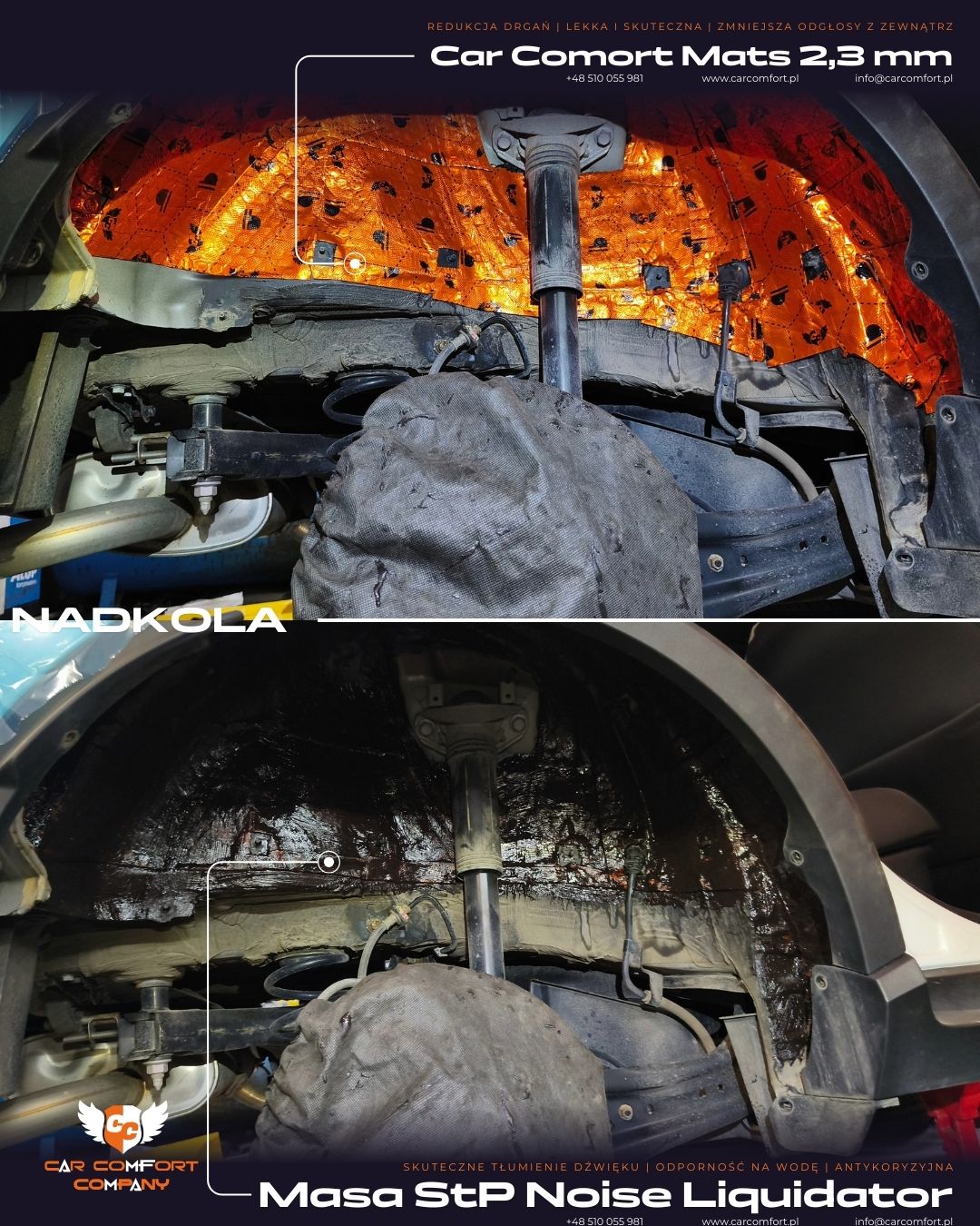 Nadkola zostały zabezpieczone matą Car Comfort Mats 2,3 mm, a jako warstwę tłumiącą zastosowano StP Noise Liquidator, który redukuje drgania i szum toczenia.
