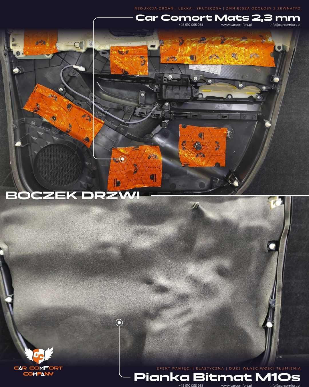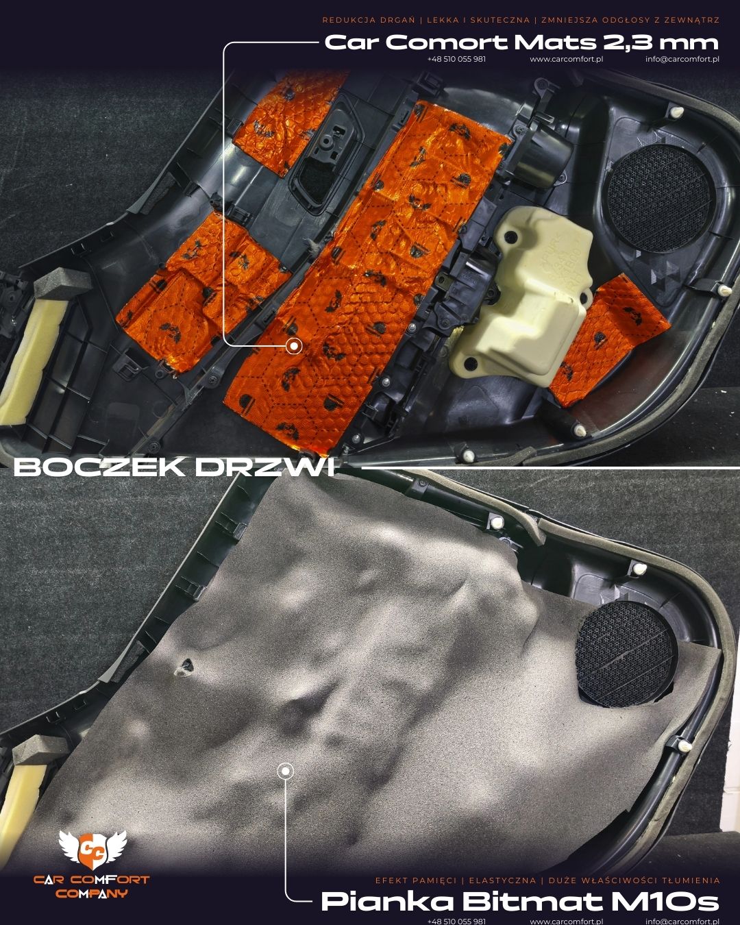 Drzwi wyciszono matą Car Comfort Mats 2,3 mm, która skutecznie usztywnia blachę i ogranicza drgania. Dodatkowo zastosowano StP Sealing Cord 6 mm, poprawiający szczelność drzwi i redukujący szum powietrza podczas jazdy.
