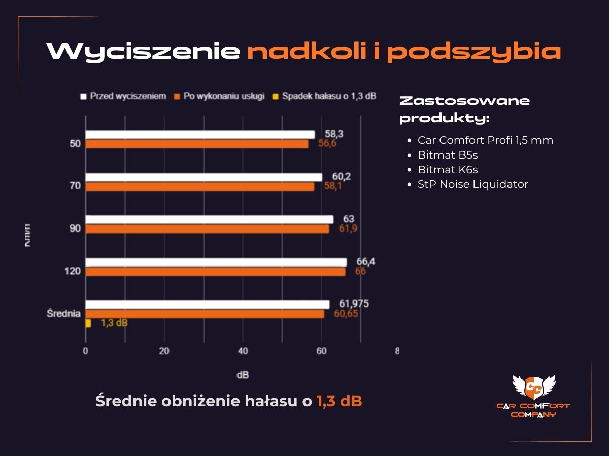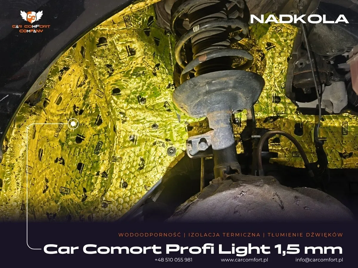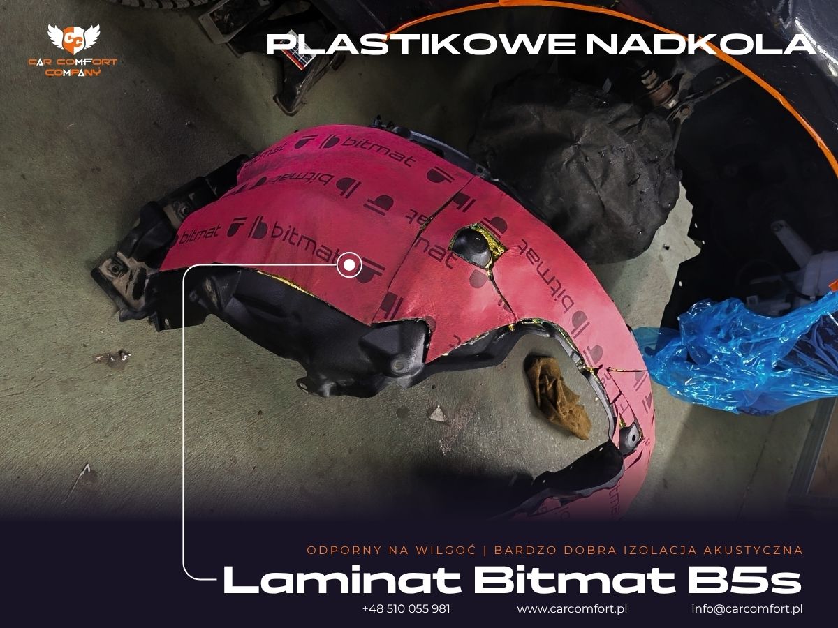 - Na wewnętrzną stronę plastikowych osłon nadkoli (bądź filców) wykorzystano Bitmat B5s 5mm. Ten innowacyjny kompozyt 2w1 (pianka granulowana z masą butylową bez aluminium) działa jako izolator akustyczny, pochłaniając szum drogowy i zapobiegając rezonansom plastikowych elementów. Bitmat B5s jest również odporny na wilgoć, co czyni go idealnym do tej strefy.