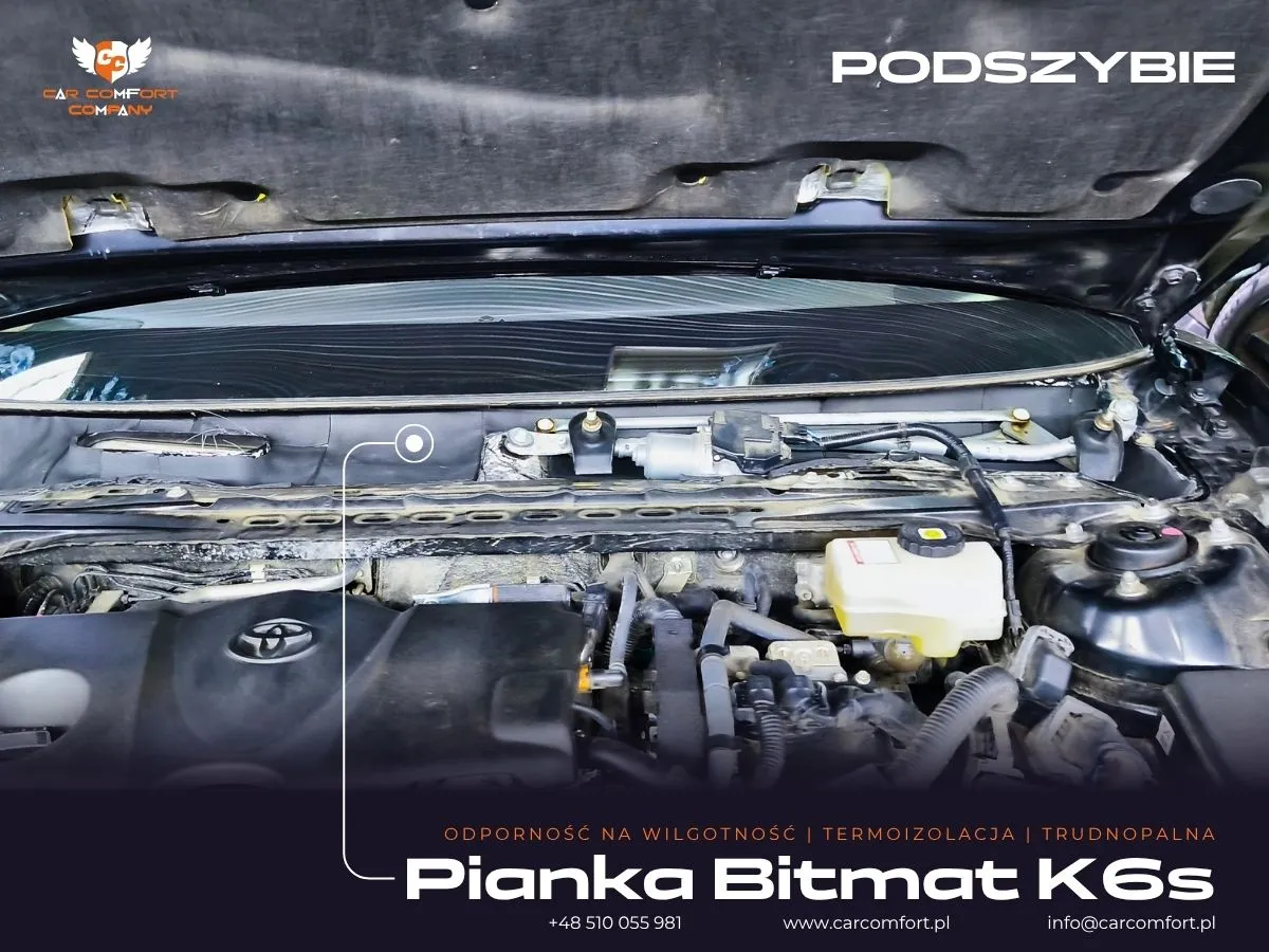 Dzięki precyzyjnej obróbce przednich nadkoli i podszybia za pomocą zaawansowanych materiałów (StP Noise Liquidator, Bitmat B5s, K6s), Toyota Camry zyskała znaczącą poprawę komfortu akustycznego. Potwierdzona redukcja hałasu o 1,3 dB przekłada się na bardziej cichą, relaksującą i luksusową podróż.