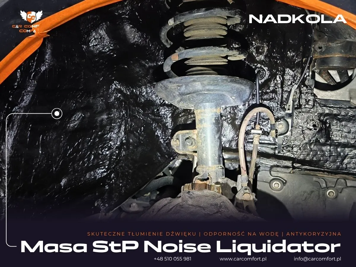 - Na zewnętrzną metalową część nadkoli zaaplikowano StP Noise Liquidator A+B. Ta dwuskładnikowa masa w płynie, po utwardzeniu, tworzy twardą i trwałą powłokę. Jej zadaniem było usztywnienie blachy, skuteczne wyeliminowanie wibracji, a także stworzenie bariery antykorozyjnej i ochronnej przed uszkodzeniami mechanicznymi.