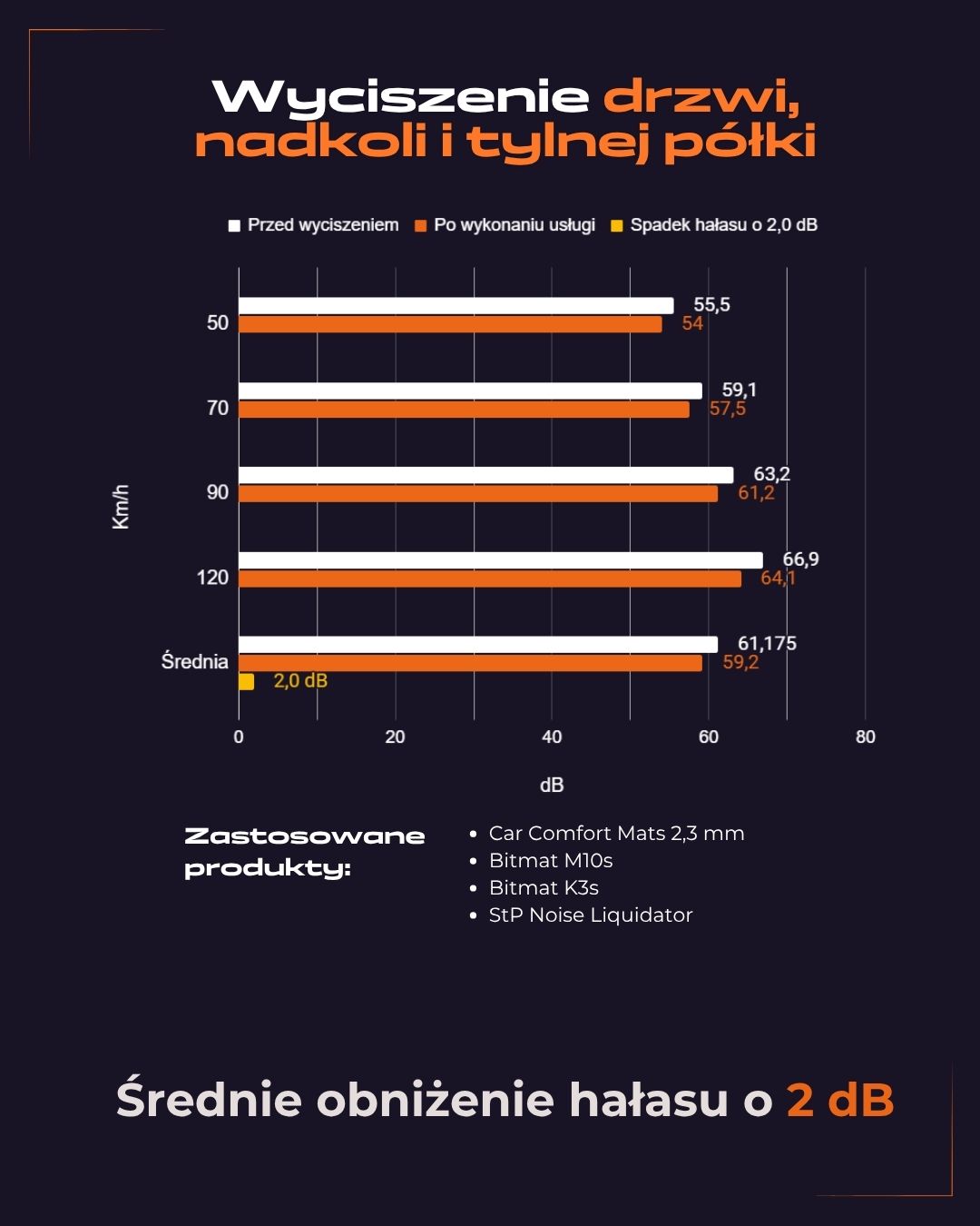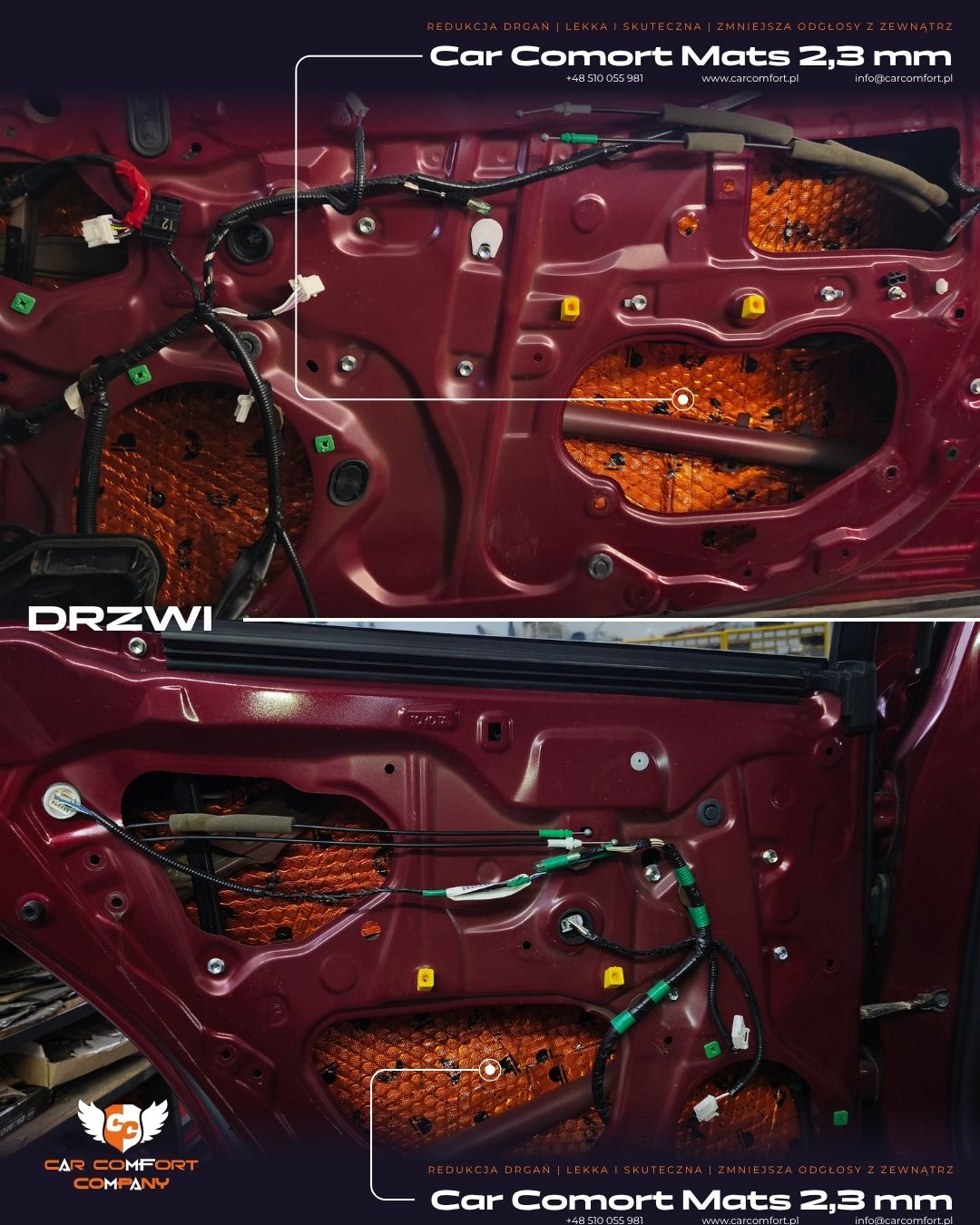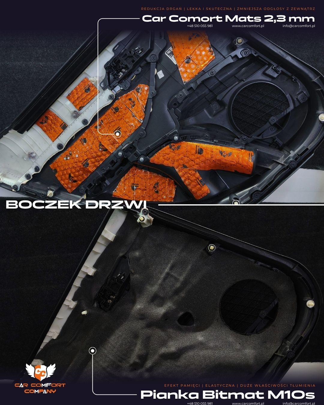 Drzwi zostały wyciszone matą Car Comfort Mats 2,3 mm, która skutecznie tłumi drgania konstrukcji.