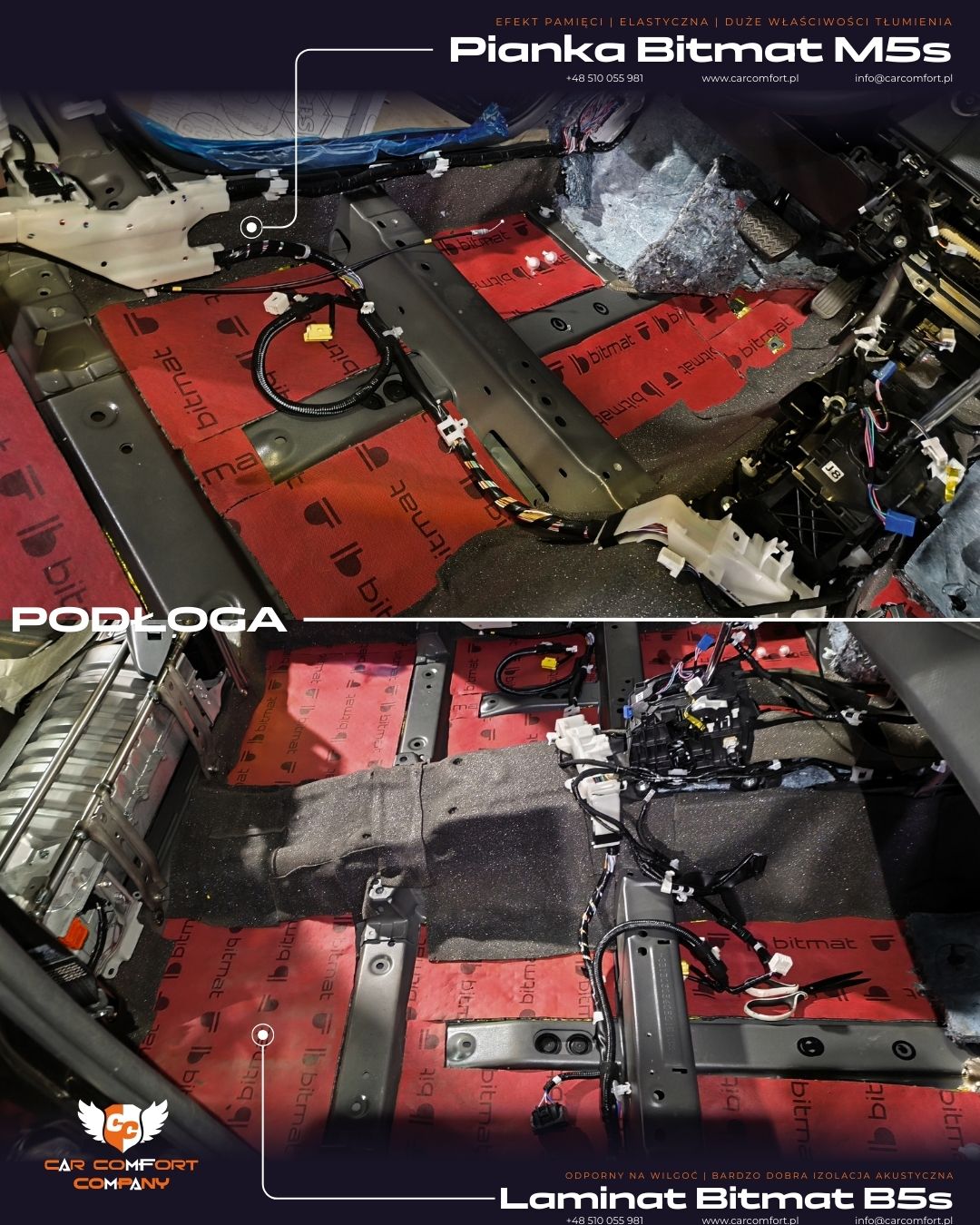 Podłoga została dodatkowo wygłuszona pianką Bitmat M5s oraz laminatem Bitmat B5s, co znacząco ogranicza hałas drogowy przenikający do kabiny.