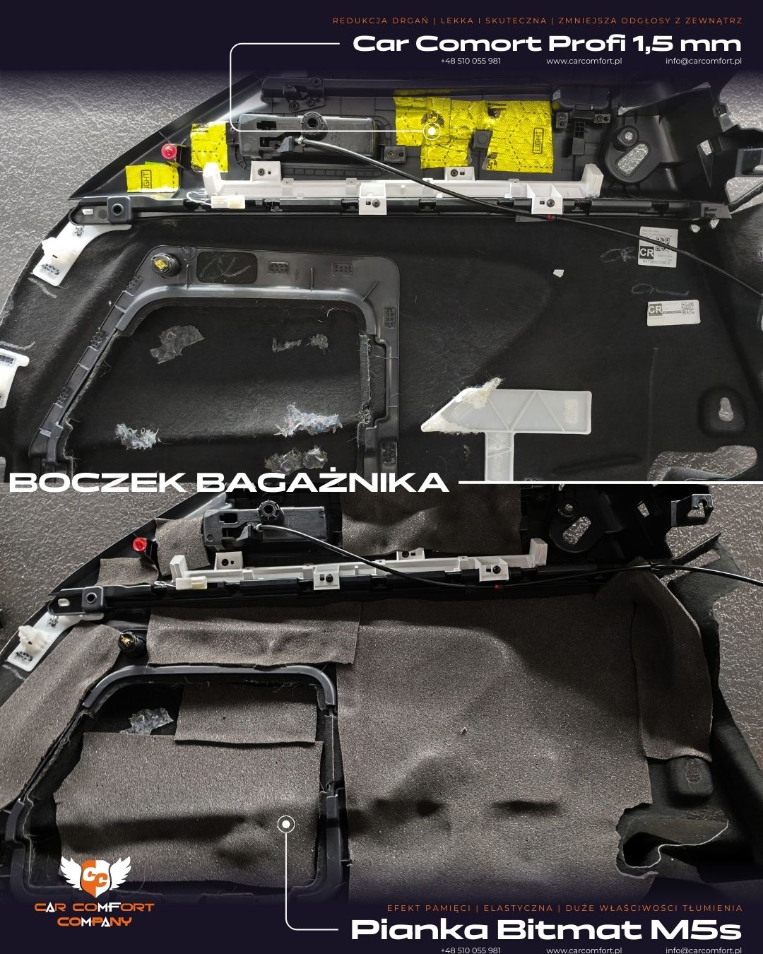 W bagażniku zastosowano matę Car Comfort Profi oraz Bitmat B5s, a boczki bagażnika otrzymały dodatkowo warstwę Bitmat M5s, co redukuje rezonanse i poprawia komfort akustyczny tylnej części pojazdu.