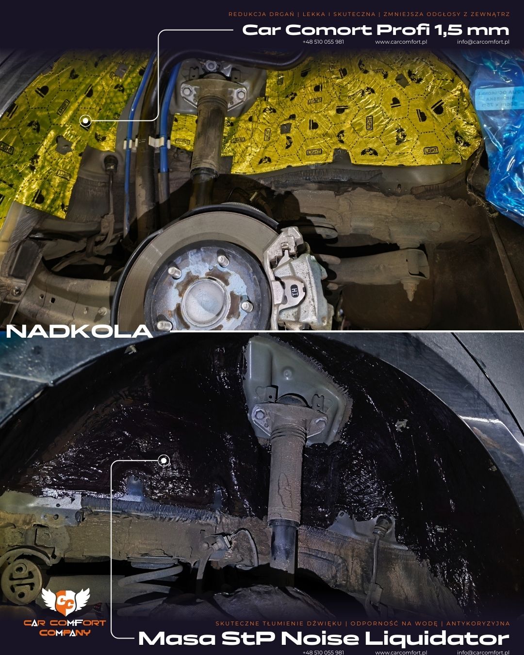 Metalowe nadkola zabezpieczono matą Car Comfort Profi 1,5 mm, a jako warstwę tłumiącą zastosowano StP Noise Liquidator, który skutecznie redukuje drgania i szum generowany przez opony.