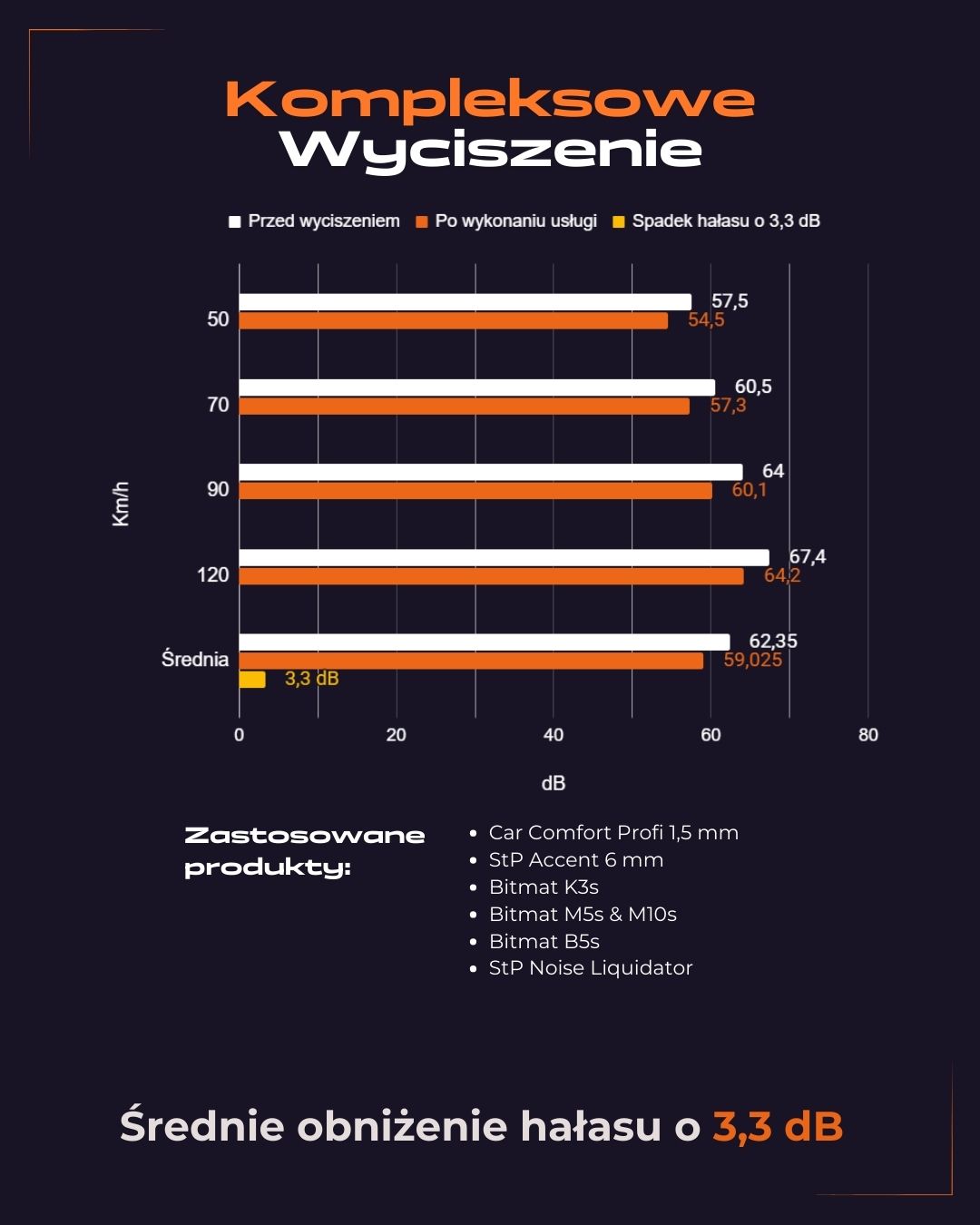 Efektem całości prac jest realna redukcja hałasu o 3,3 dB, szczególnie odczuwalna podczas jazdy po nierównych nawierzchniach i przy wyższych prędkościach.