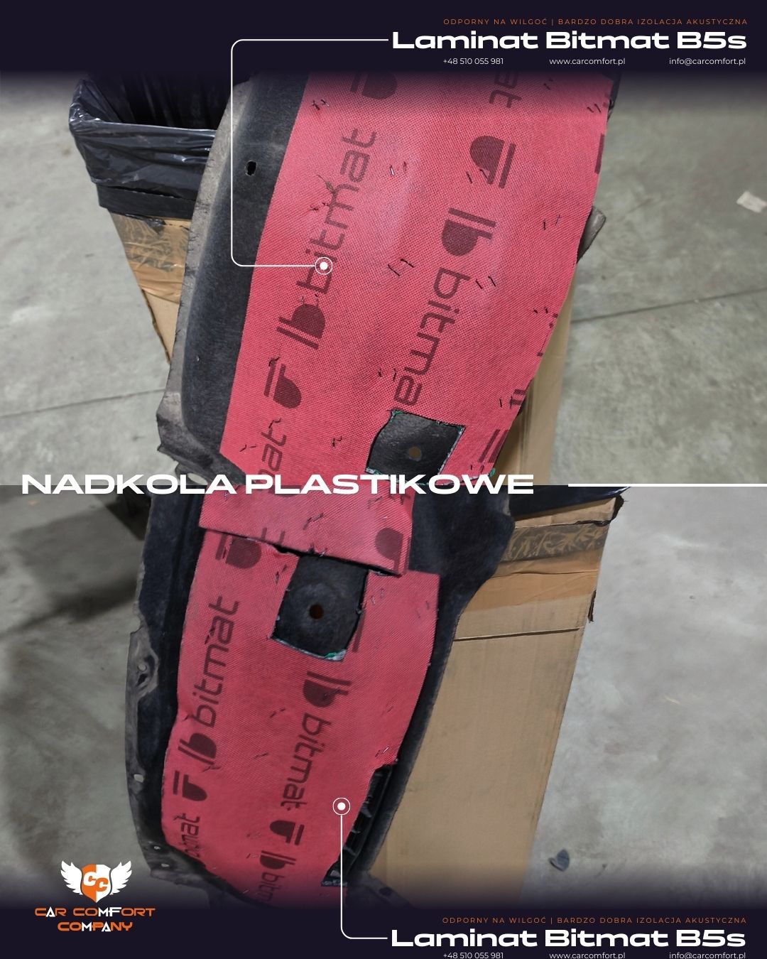 Plastikowe nadkola wyciszono przy użyciu Bitmat B5s, który dobrze sprawdza się w strefach narażonych na wilgoć i zabrudzenia.